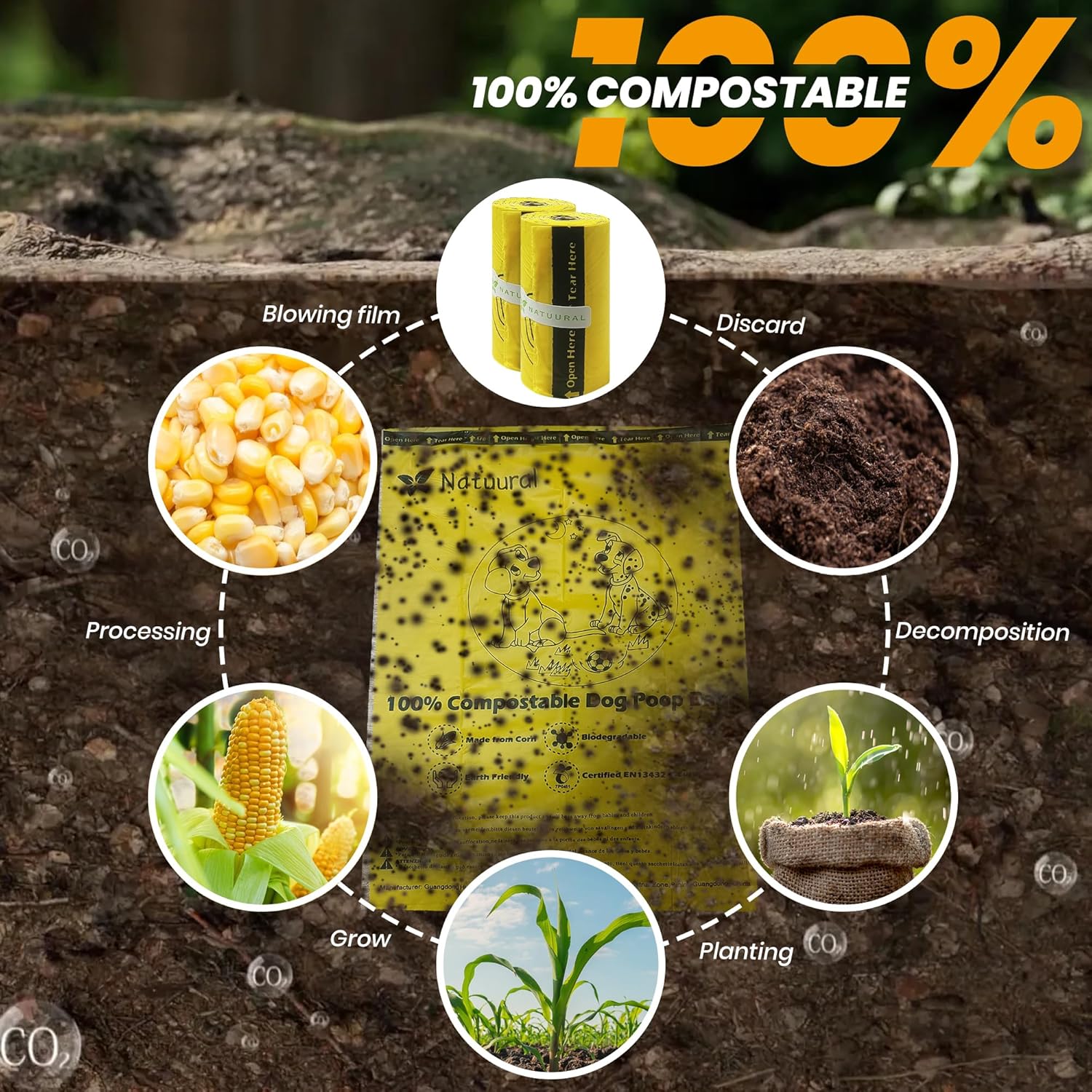 • [Certified Compostable] Our compostable dog poop bags are designed from plant-based materials. We only use corn starch, PBAT (fully compostable polymers) of our doggie poop bags. they are complying with the highest standards of US ASTM D6400, NF T51-800:2015 and EU EN13432, they are easy to open and durable!