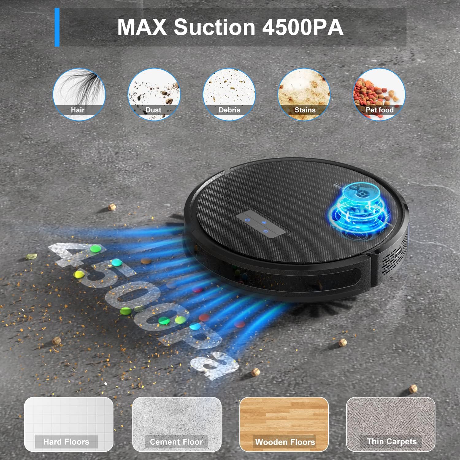 • [4500 Pa Strong Suction ]: Compared with other robotics, its powerful 4500Pa suction makes clean-up easier for this robot vacuum. Vacuum up crumbs, from carpet fibers all in a single pass
