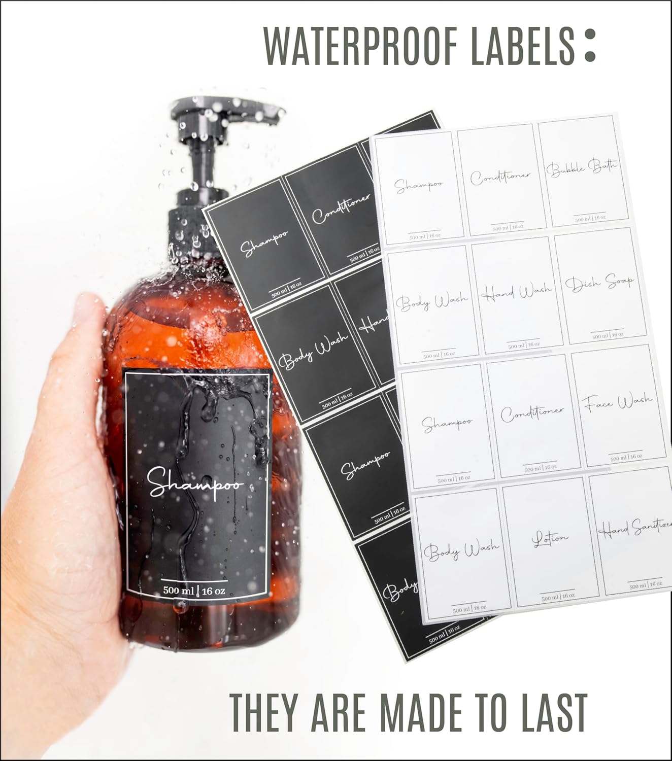 • PACK OF FIVE - Our pack includes five 16oz apothecary bottles to store your cleaning liquids, including shampoo, handwash, sanitizer, massage oils, and more. We also include 24 waterproof labels (12 black & 12 white) measuring 2.36in (6cm) by 2.76in (7cm) for easy labeling and customization.