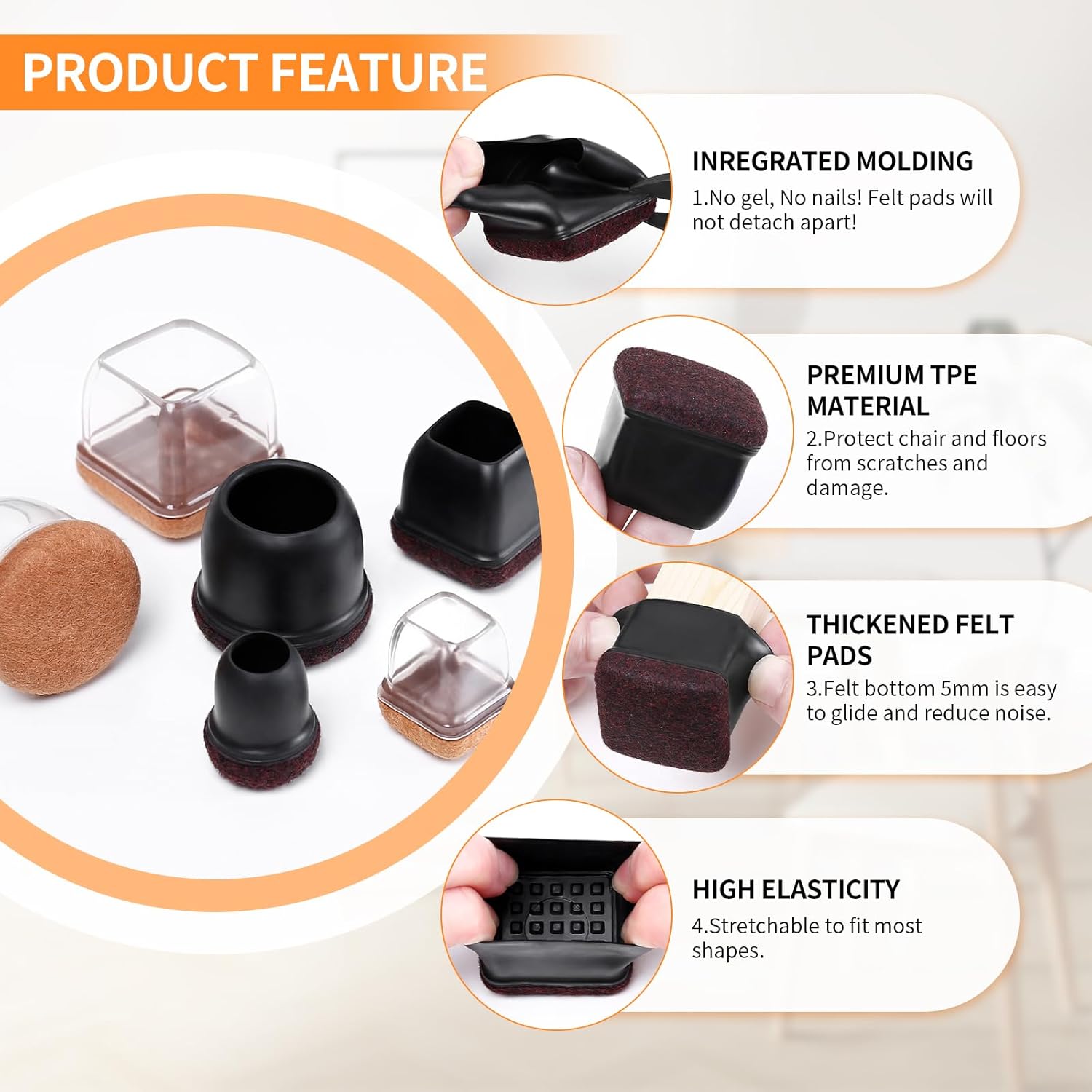 • ☛【Reduce Noise and Prevent Scratches】- chair socks for hardwood floors more durable to friction and no scratches. Felt pad on the bottom reduces resistance and allow easy, smooth movement of furniture.