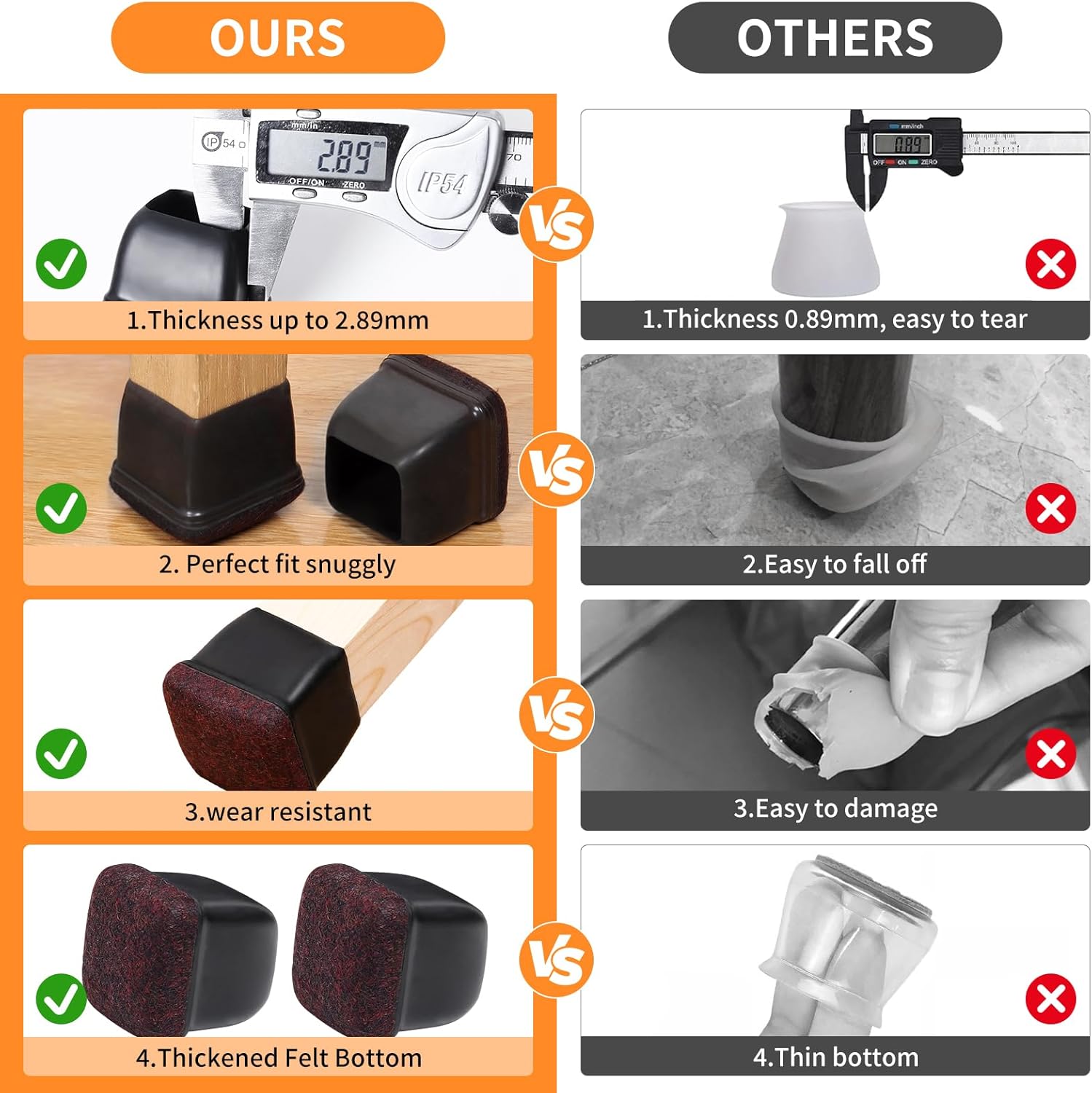 • ☛【Applicable Range】- It is specially designed for square furniture legs. It is only applicable to furniture legs with an outer length of 1.5" (38.1mm) to 2" (50.8mm). Measure the lengths of the two opposite sides at the widest part of the leg tube to ensure that both are within the above-mentioned size range.
