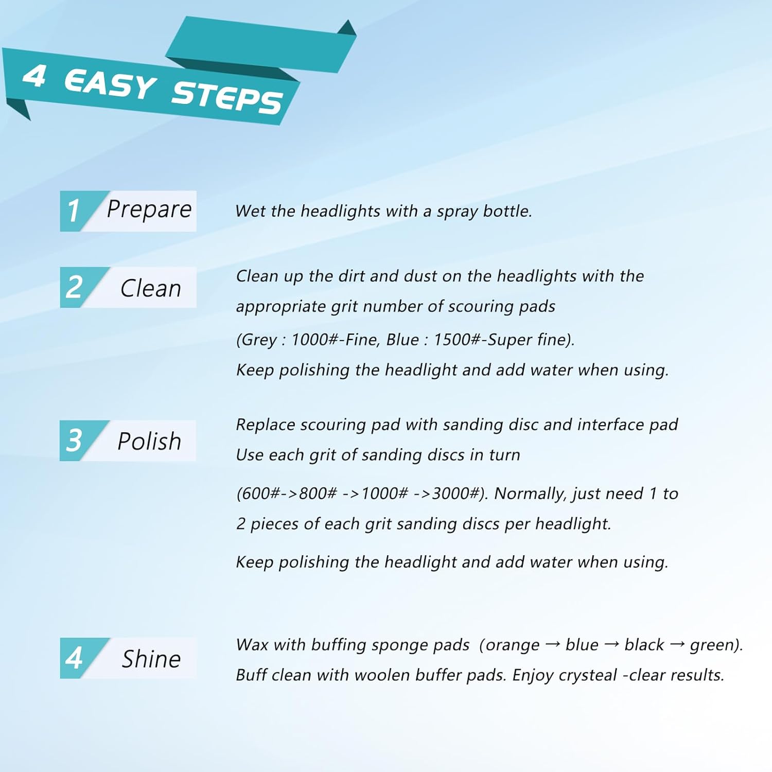 • 【EASY 4-STEP】Step 1 - Prepare a spray bottle of water and drill. Step 2 - Clean with gray scouring pads (P1000) →blue scouring pads (P1500). Step 3 - Polishing with abrasive discs (P600 → P800 → P1000 → P3000) and clean of the lens when finish. Wax with buffing sponge pads (orange → blue → black → green). Step 4 - Buff clean with woolen buffer pads. Physical restoration with headlight restoration pads, without any chemical fluid, safe and environmental-friendly.
