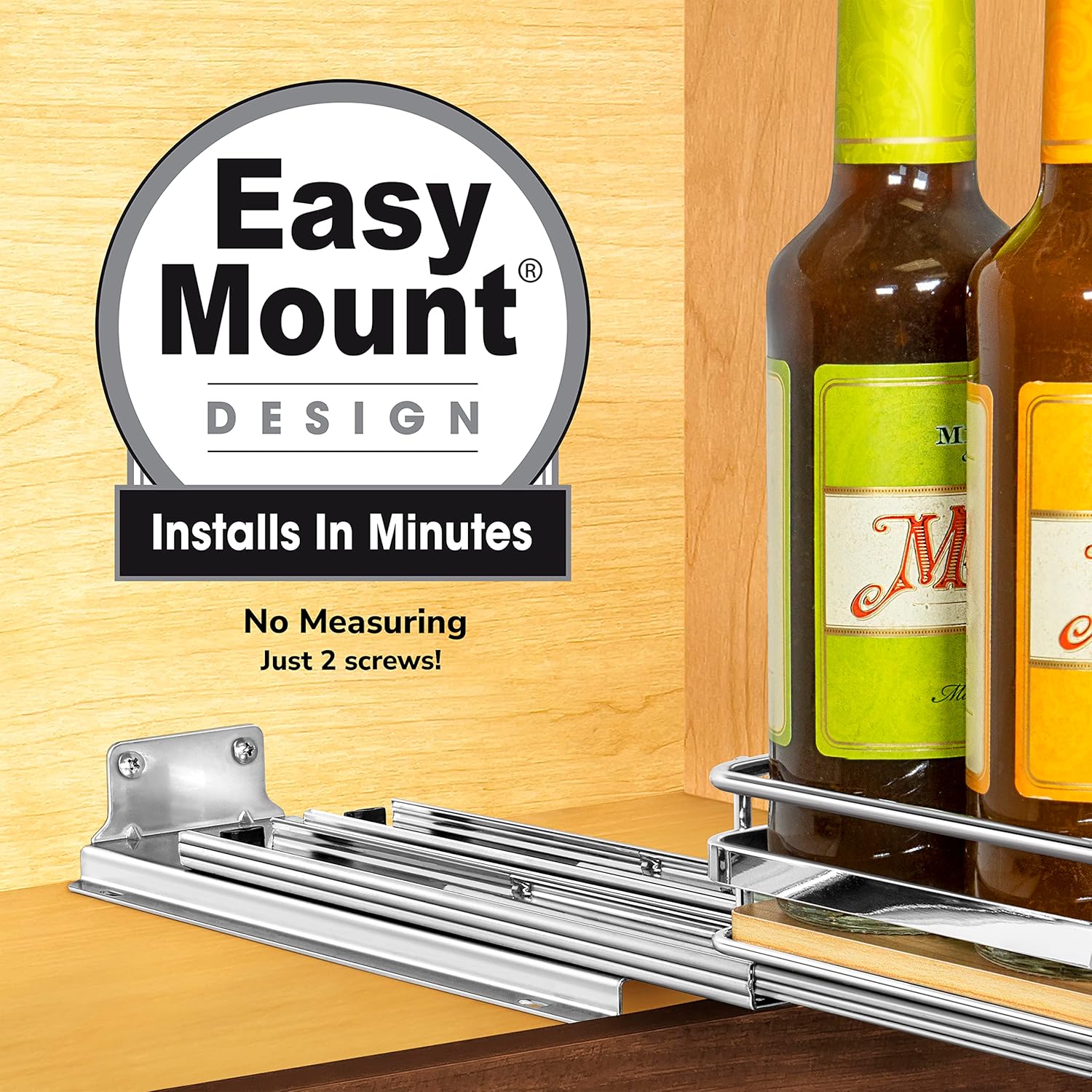 • SETUP IS A BREEZE! – no struggling within limited space trying to place four awkward and difficult to reach screws inside your upper cabinets or into pantry shelves – our exclusive EASY MOUNT cabinet friendly drawer design installs with just two screws in the easily accessible back of your narrow cabinets – in minutes with no measuring!