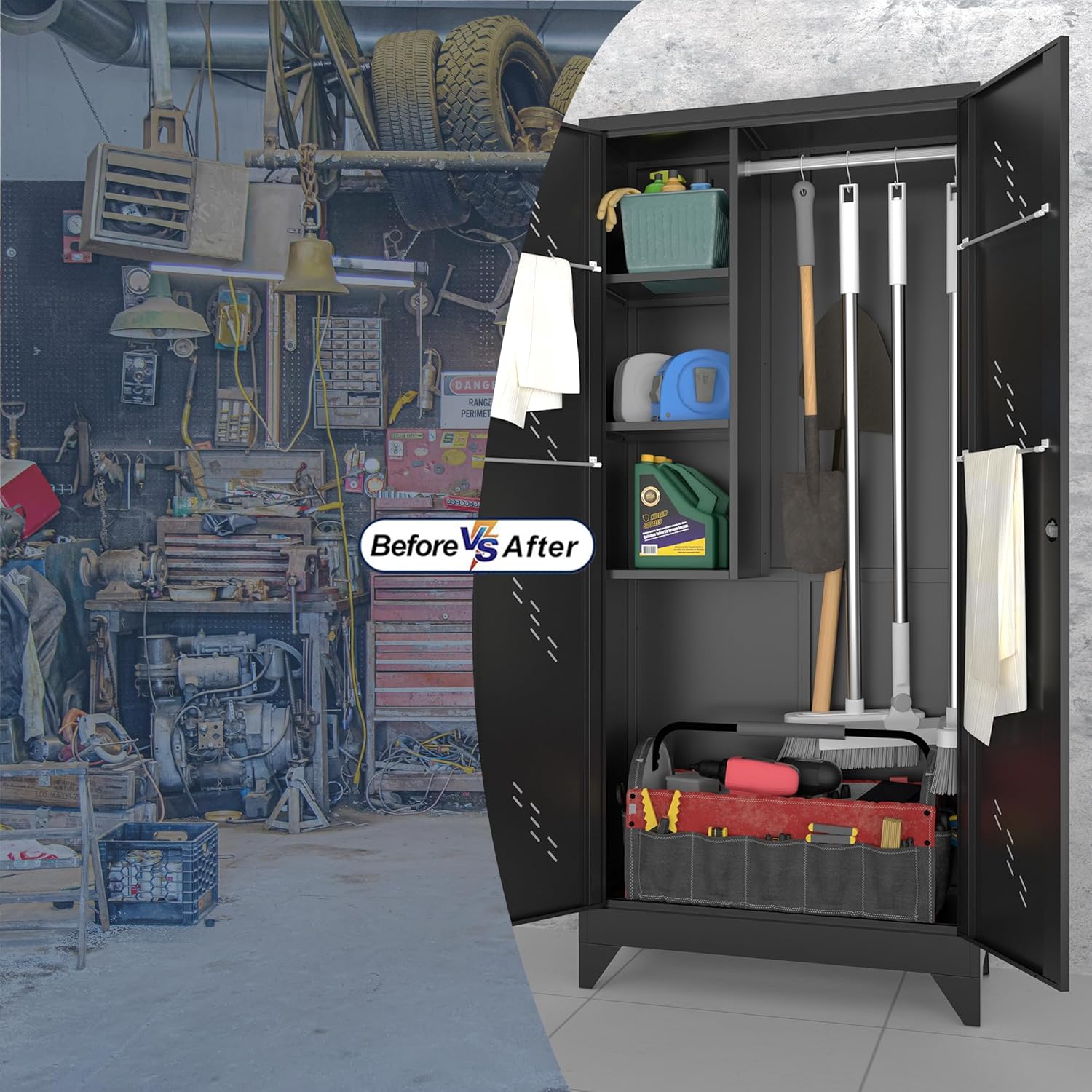 - 【Durable Construction】-Made of all-steel material and powder-coated, our broom closet cabinet is built to last. The high lockers with doors have strong corrosion resistance and rust resistance, making them more durable than wooden lockers. This ensures that your items are safely stored and protected for a long time.
