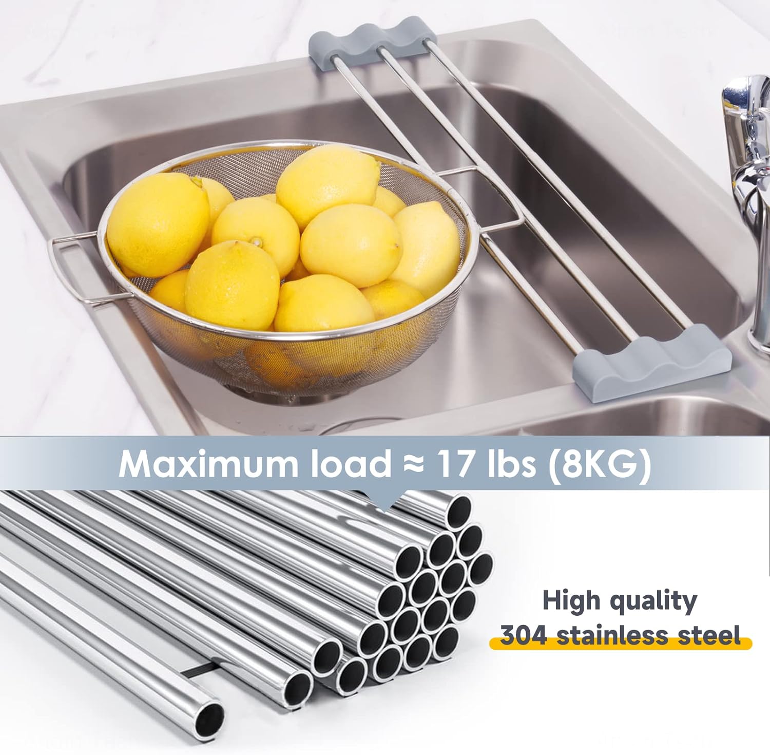 - ✅【Rack for Kitchen Sink Accessories】This newest 3-bar sink bottle drying rack features three 304 stainless steel rods that can withstand weights up to 16.5 lbs (7.5 kg), approximately 6 times that of the competing products. Dishwasher safe with heat resistance up to 428°F (220°C). It can be extended from 12 inches (30.5 cm) to 21.65 inches (55 cm) to fit most sinks on the market. Please check your sink size before purchasing this dish towel rack.