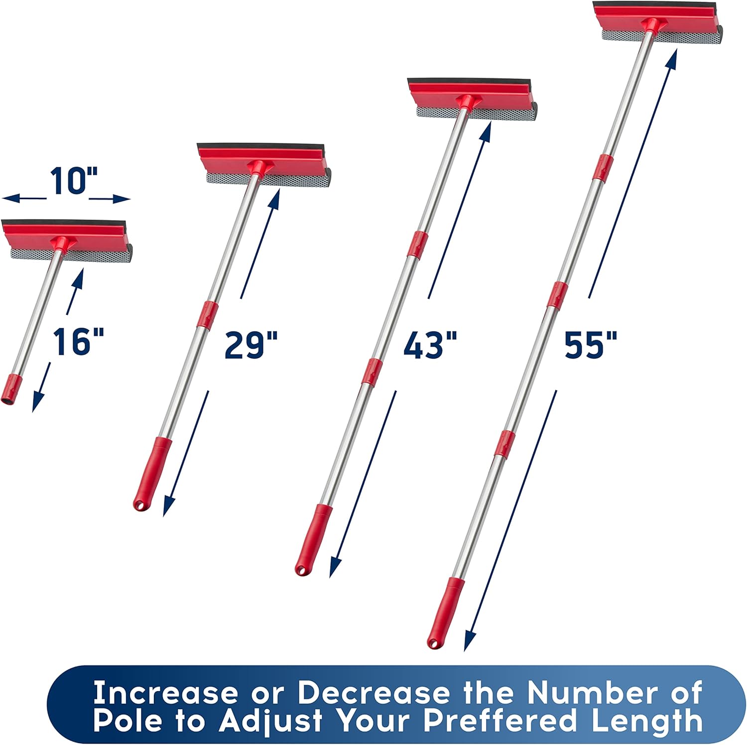 - 【EASY TO USE】 2 in 1 Function Window Cleaning Tool With 4 Section Of Extension Poles, You Can Adjust Length According To Your Needs (FROM 16'' TO 55''). Our Telescopic Window Squeegee for Window Cleaning Includes Two Parts: Rubber Strip and High Quality Sponge (10 inches). It is Convenient to Use the Sponge Scrubber to Clean Windows, the Rrubber Squeegee to Wipe Water. This All-in-One Set is All You Ever Need to Quickly and Efficiently Clean Windows, Shower Doors and Any Other Smooth Surface.