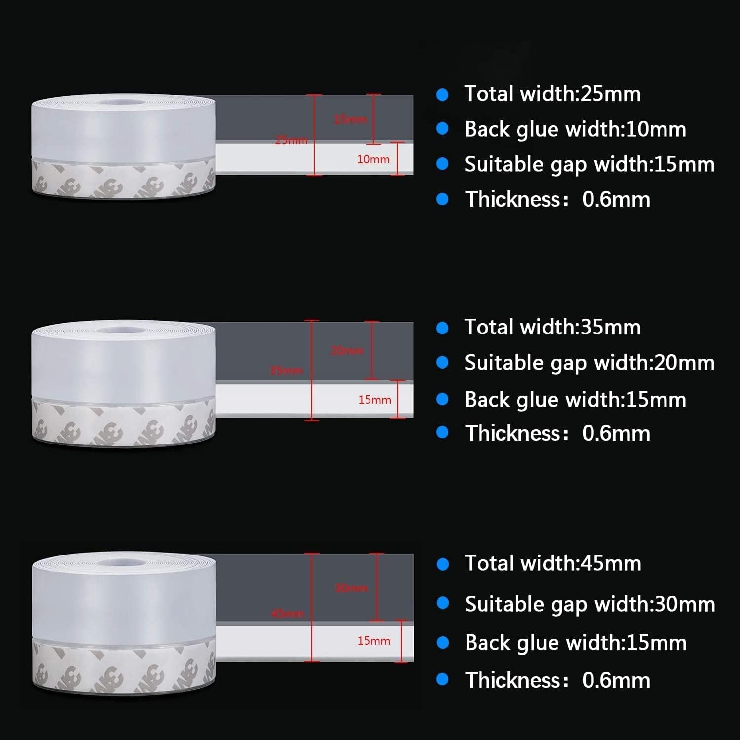 • 【Width Selection】The total length of the sealing strip is 33 feet, thickness of 0.02 inch and can be cut to your needs. A gap of 0-15mm is recommended to select a 25mm width seal; a 0-20mm gap is recommended to select a 35mm width seal; a 0-30mm gap is recommended to select a 45mm width seal.