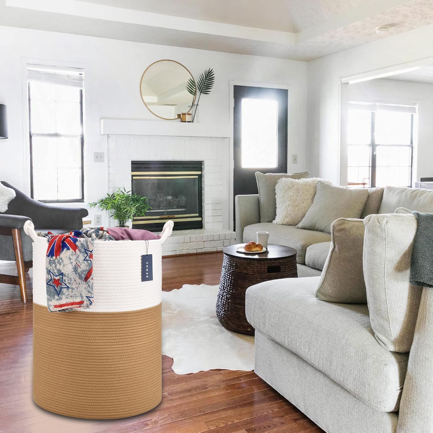 COMSE Extra Large Blanket Basket, Tall Woven Storage Basket, Nursery Hamper, 15.7”x 21.7”, Cotton Rope Laundry Hamper for Toys Clothes Towels, White/Camel