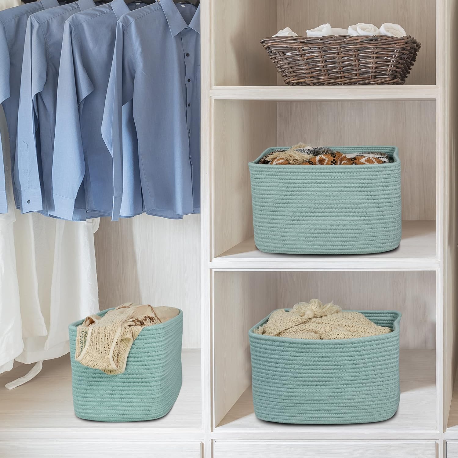 Cotton Rope storage Basket Bins Woven Basket for Organizing Shelves Rectangle Decorative Baskets For storage Clothes Toys Books Towels Square Wicker Nursery basket organizer 3 pack Green