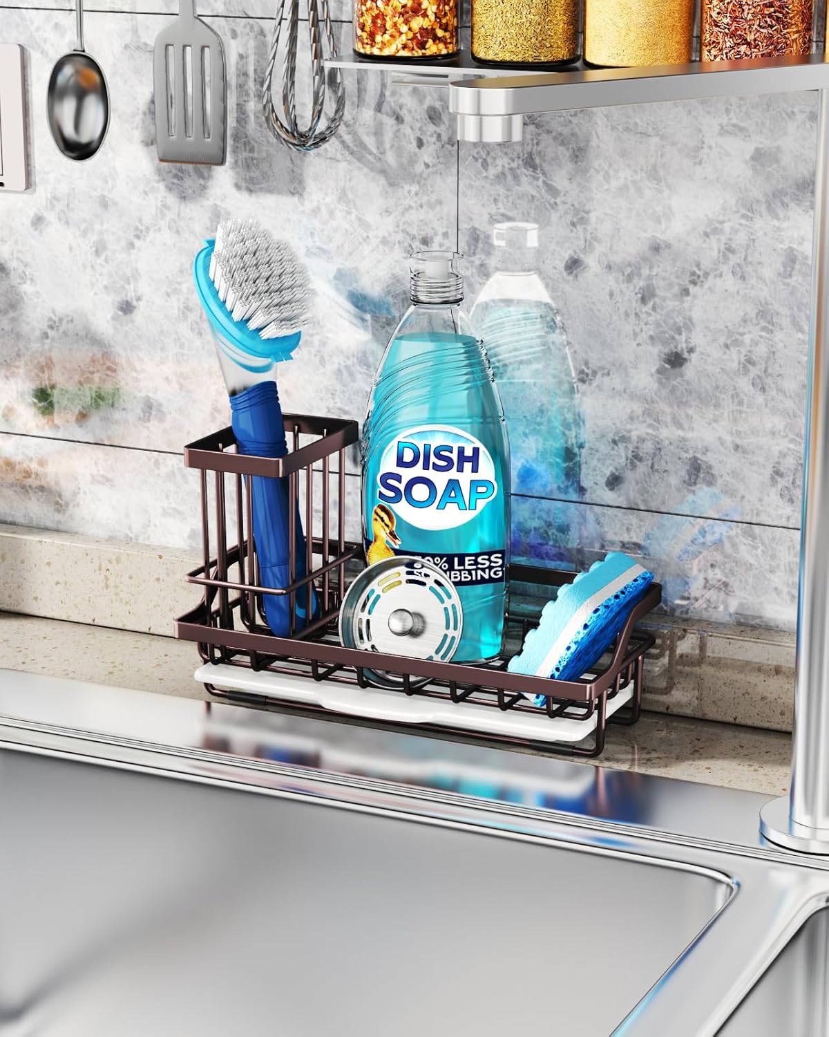 - [Counters Tidier - Sponges Drier]: This sponge holder is perfect to organize your sponges, dish soap, brush in one place, make brush upright help them dry quicker. Kitchen sink caddy size is 8.26 * 3.54 * 4.7 in, an excellent helper for sink organization