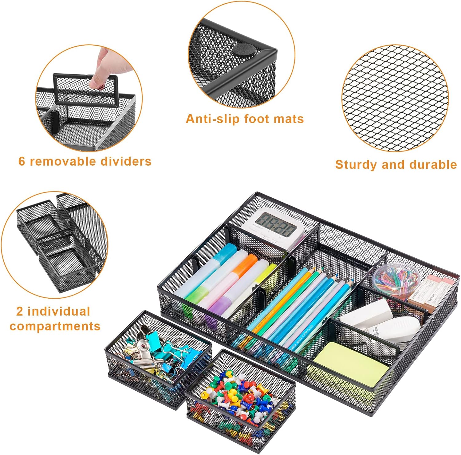 • 【Stury and Durable】Made of sturdy black wire mesh structure with powder coated surface, smooth and corrosion-resistant. Non-slip feet can keep the product stable.Big Drawer:12*8.3*2.2inches;2PC Small Drawers:3.5*3*1.9inches