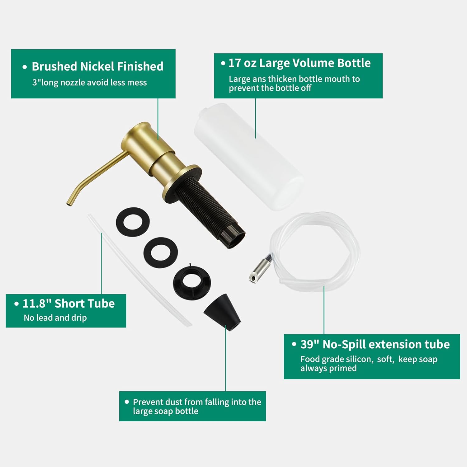 - ๐งใ NO MORE REFILL REQUENTLYใ The Countertop Soap Dispenser for kitchen sink comes with 17oz large volume bottle, it can be connected to bottle or extension tube,once filled, can last longer. The long nozzle of soap dispensers will make sure no soap will sprinkle on the sides of your sink. No more sticky and dirty areas. Your kitchen sink will look much more precious and clean.