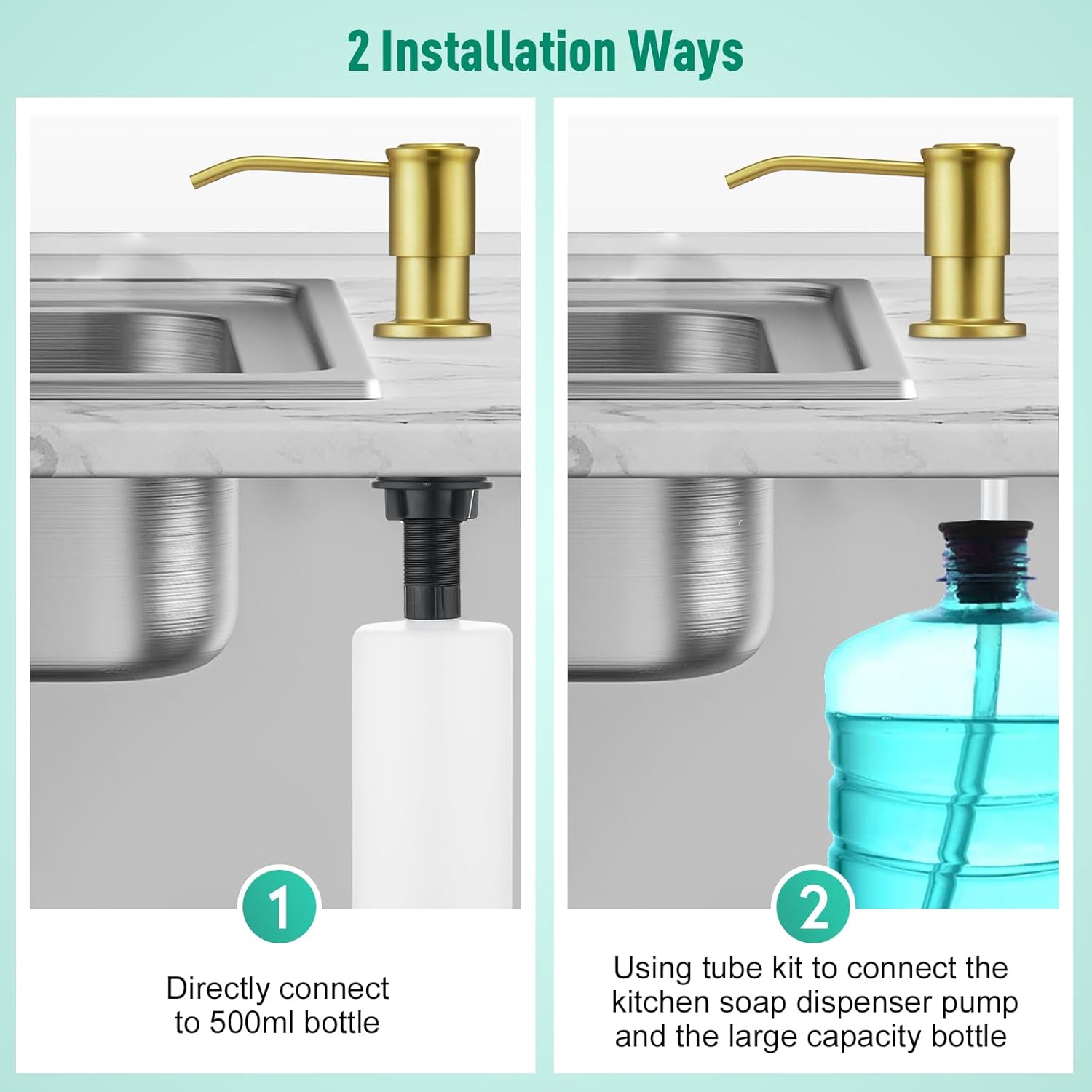 - ๐งใFAST AND EASY INSTALLATIONใ The kitchen soap dispenser comes with detailed instructions. You can install this kitchen sink soap dispenser on the sink or countertop in a few minutes. Even for lay people, just connect with extension tube kit,use the big bottle directly, skipping the messy for refilling.Then enjoy your new soap dispenser.
