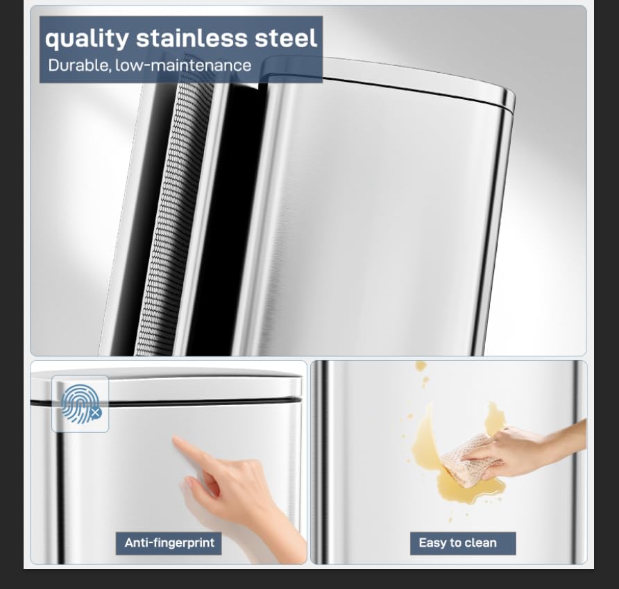 - 【410 Stainless Steel 】30/50L kitchen trash can is made of stainless steel and adopts a wire drawing process. It has a delicate appearance and is easy to clean. It also remains bright and new after long-term use. With the oval shape, it can add elegant and fashionable decoration to your home or office.
