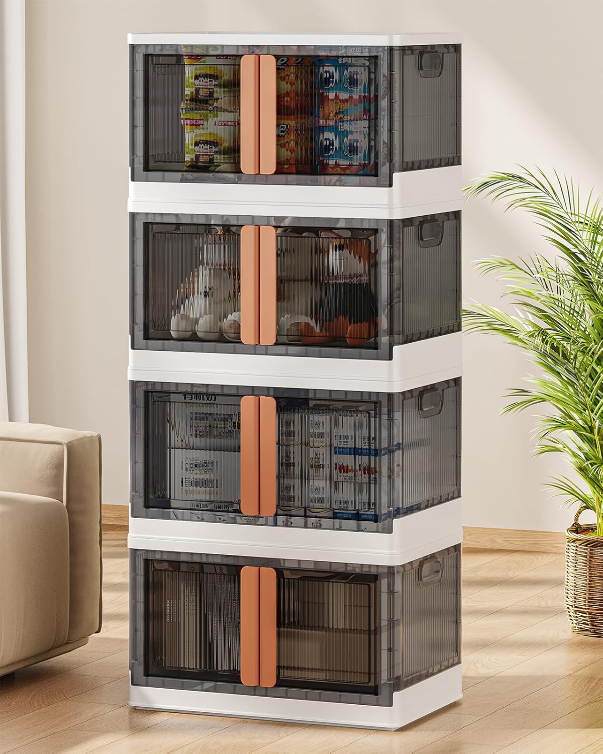 19Gal Collapsible Storage Bins with Lids & Wheels - 4 Pack Stackable with Doors, Heavy-Duty Plastic Containers for Home/Office, White