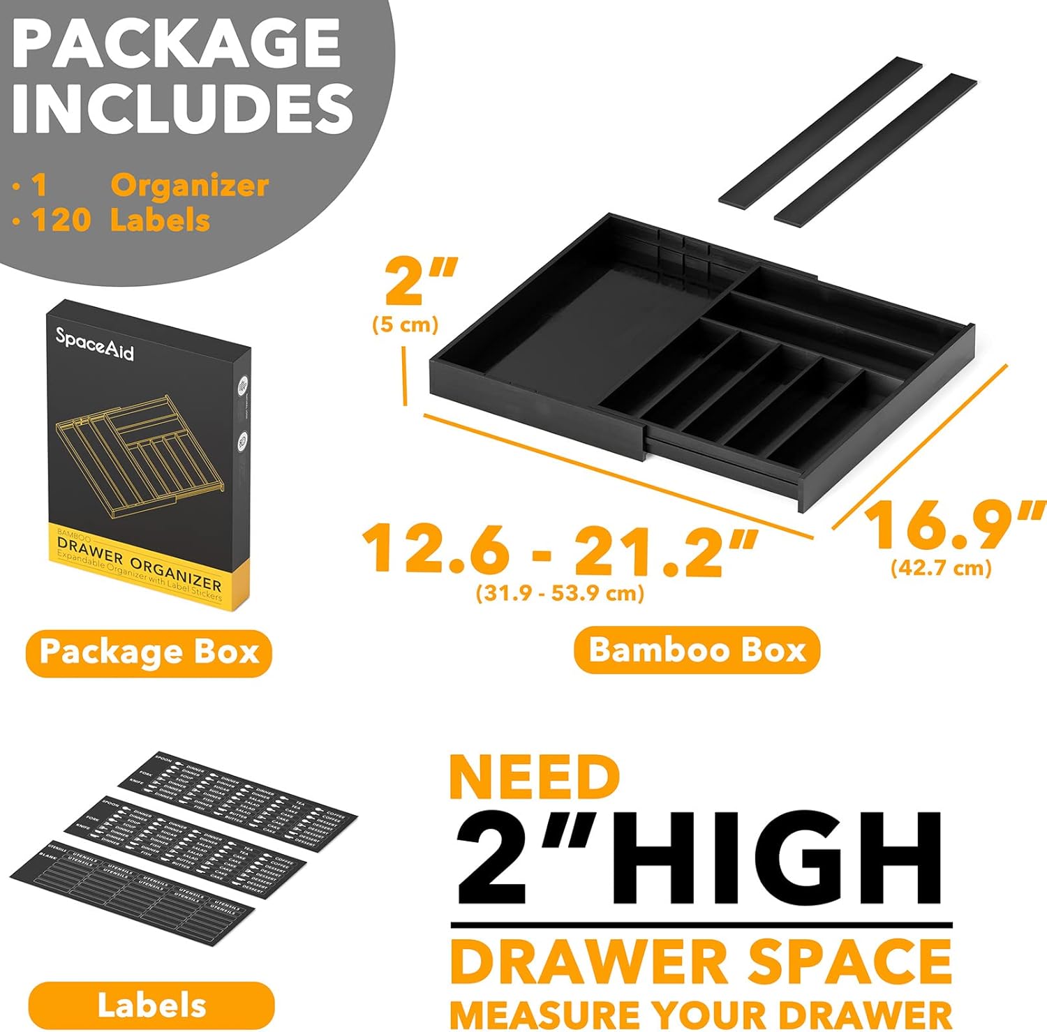 • KITCHEN UTENSILS STORAGE - Designed to hold silverware, utensil, flatware, cutlery, spoons and knives; The bamboo organizer for kitchen storage organization is 2" High; MEASURE YOUR DRAWER HEIGHT FIRST