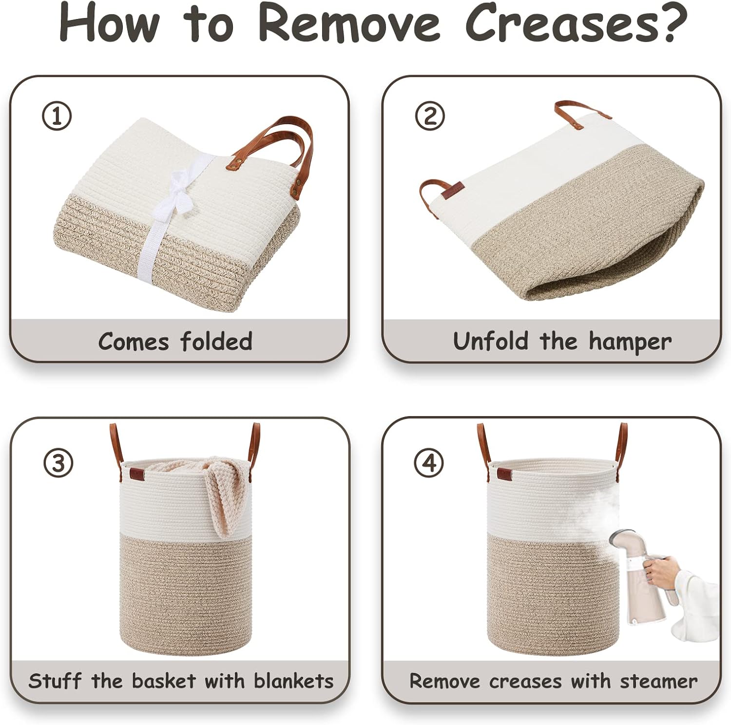 - ❤【WAY TO RESTORE ELEGANT SHAPE】 Our collapsible baskets are folded during shipping. Please fill the hamper with clothes or blankets for a period of time. If you want to remove creases from the surface of the tall basket, you can use a steamer.
