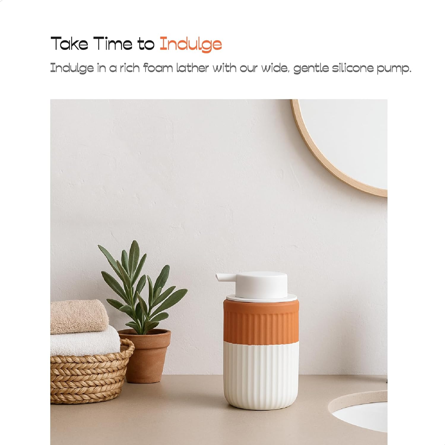 • Stylish Boho design: Features a rippled cylinder shape with natural terracotta and cream color; enhances bathroom decor with a white silicone pump and terracotta & cream body