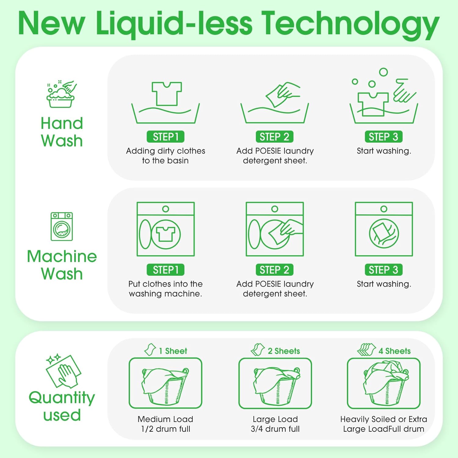 • Easier to Use - Liquidless detergent sheets, 1 sheet for small or medium loads where clothes are not very dirty, 2 sheets for large loads and 4 sheets for extra large loads, no waste. Not too little and not too much to save resources
