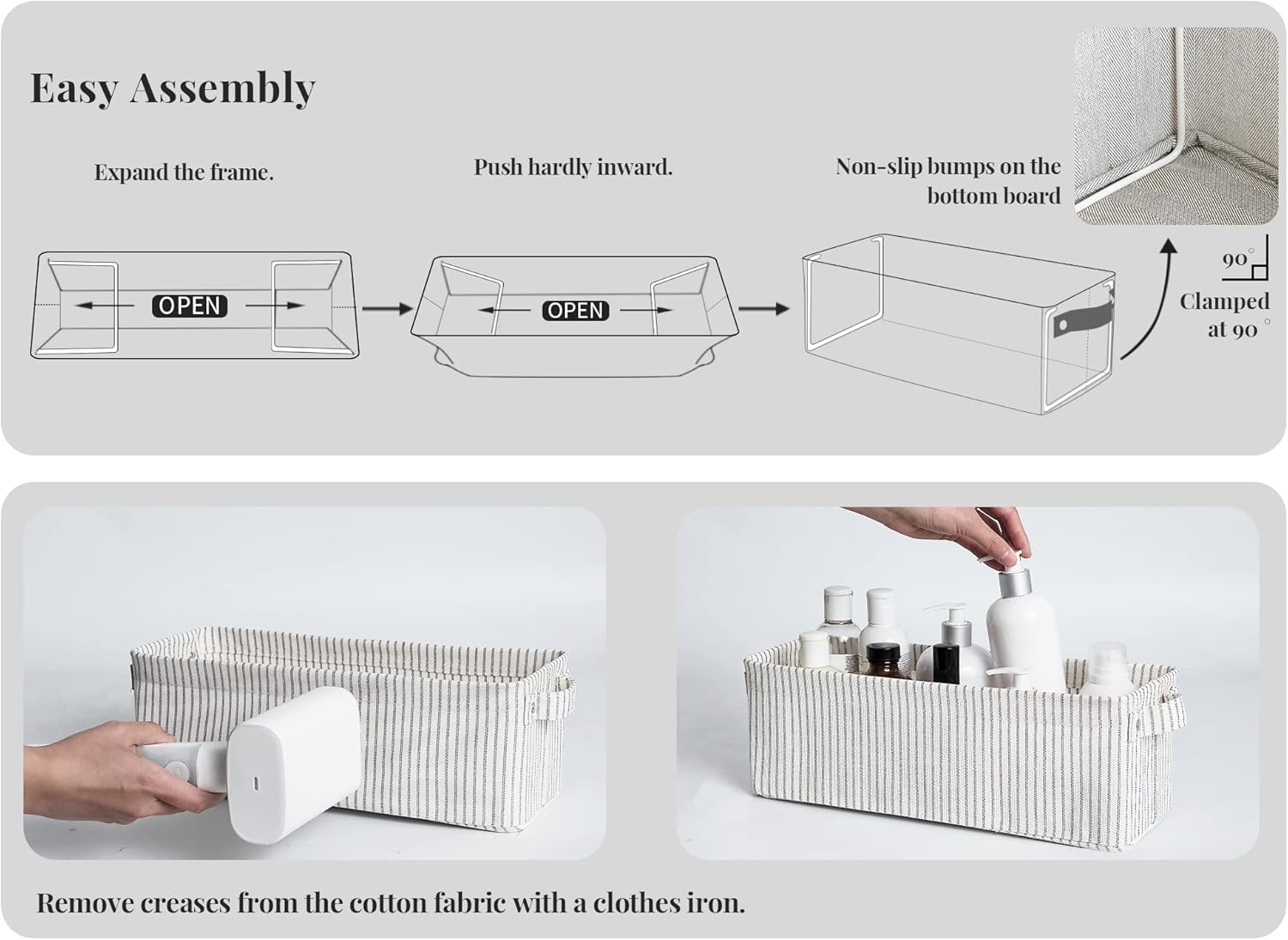 • The long storage basket features a sturdy metal support frame and non-slip bumps on the bottom board to keep it firmly upright.