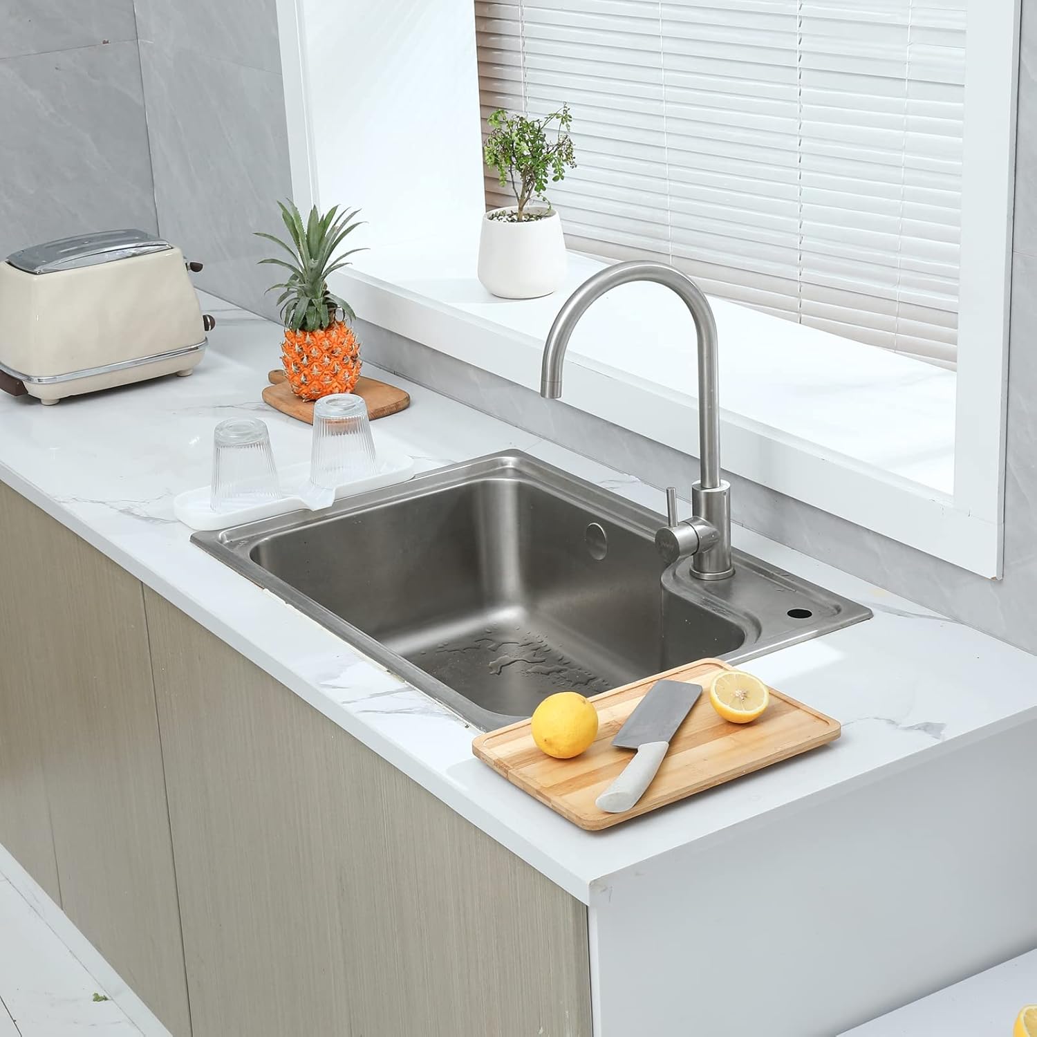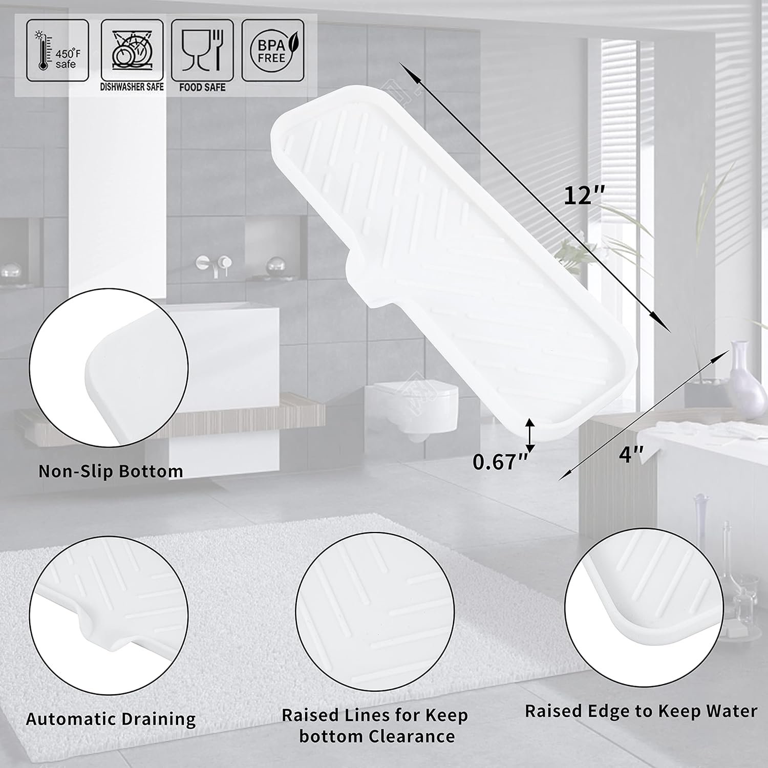 • Food Grade Silicone: The soap dispenser tray is made from high-quality food grade silicone, so it's safe for use in the kitchen or bathroom