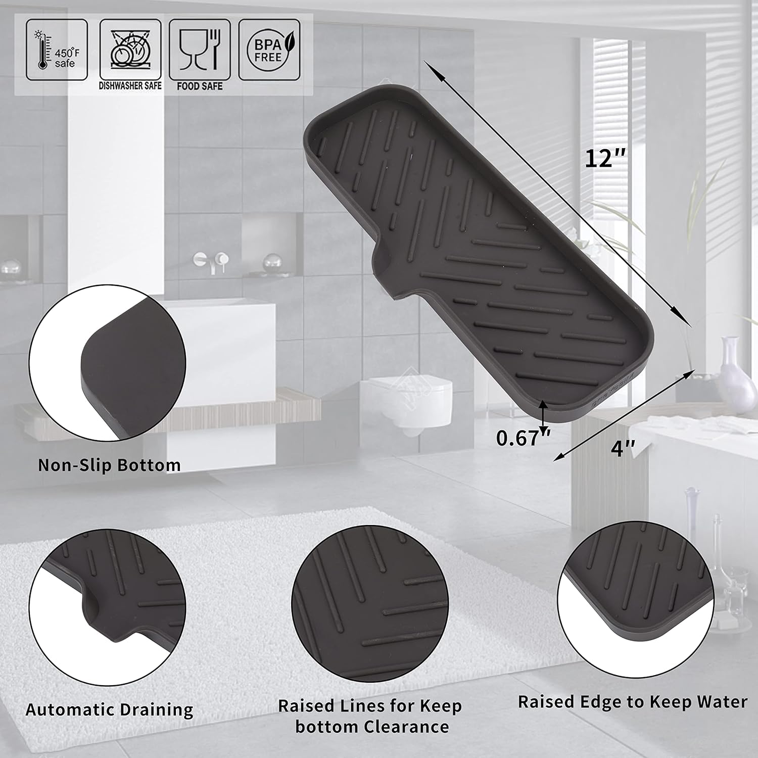 • Food Grade Silicone: The soap dispenser tray is made from high-quality food grade silicone, so it's safe for use in the kitchen or bathroom
