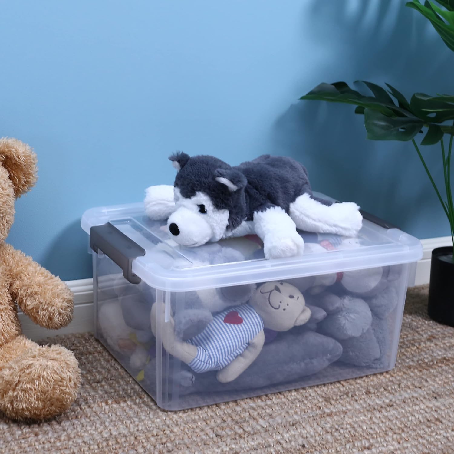 • 【17-quart Capacity】Package includes 6 containers for organizing, single measuring 15.94"L * 11.61"W * 7.28"H, capacity 17 QT. Suitable for large storage needs in the closet, garage, bedroom, basement, camping, office, etc