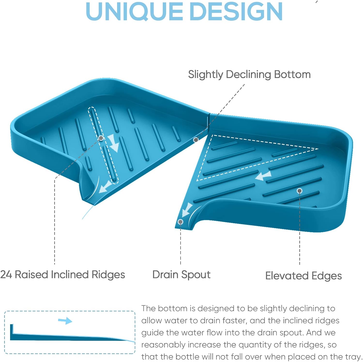 - Bottom Slope Design: Unique self-draining design, the bottom of the soap tray for kitchen sink is designed to be slightly declining to allow water to drain faster, the inclined ridges guide the water flow into the drain spout. And we reasonably increase the quantity of the ridges, so that the bottle will not fall over when placed on this kitchen sink storage tray organizer. All these unique features are specially designed after many tests.