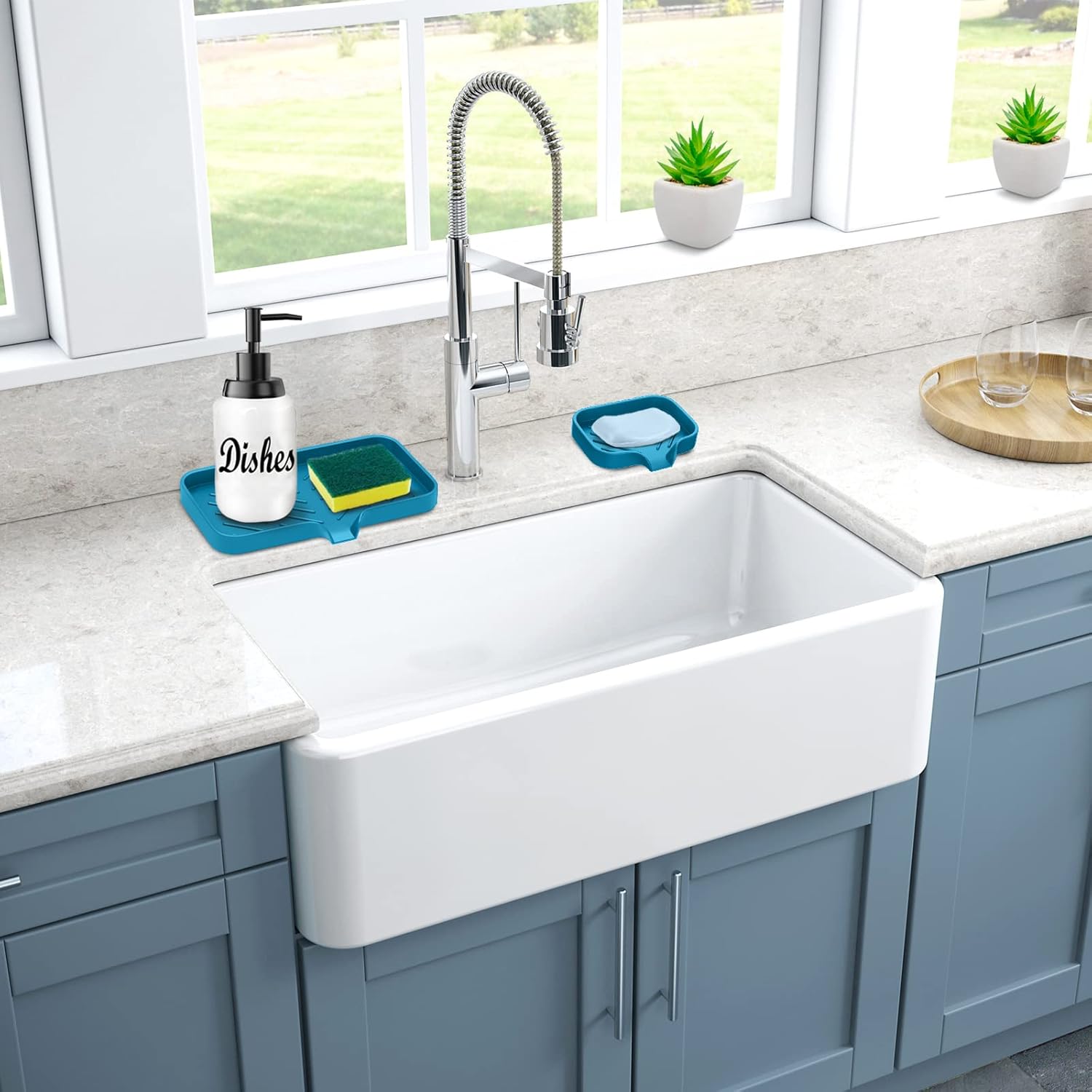 - Versatile Silicone Sink Tray: This soap dispenser bottle tray made of premium silicone, stable, won't fade, no need to worry that this dish soap tray stains or damages your counter top. This silicone soap holder is suitable for any countertops such as marble, quartz, granite, etc. In the bathroom and kitchen, use this dish soap holder as kitchen sink caddy organizer tray, soap holder for bathroom, place soap bar, dish soap bottles, dish brush, scrub sponge, soap dispenser, etc.