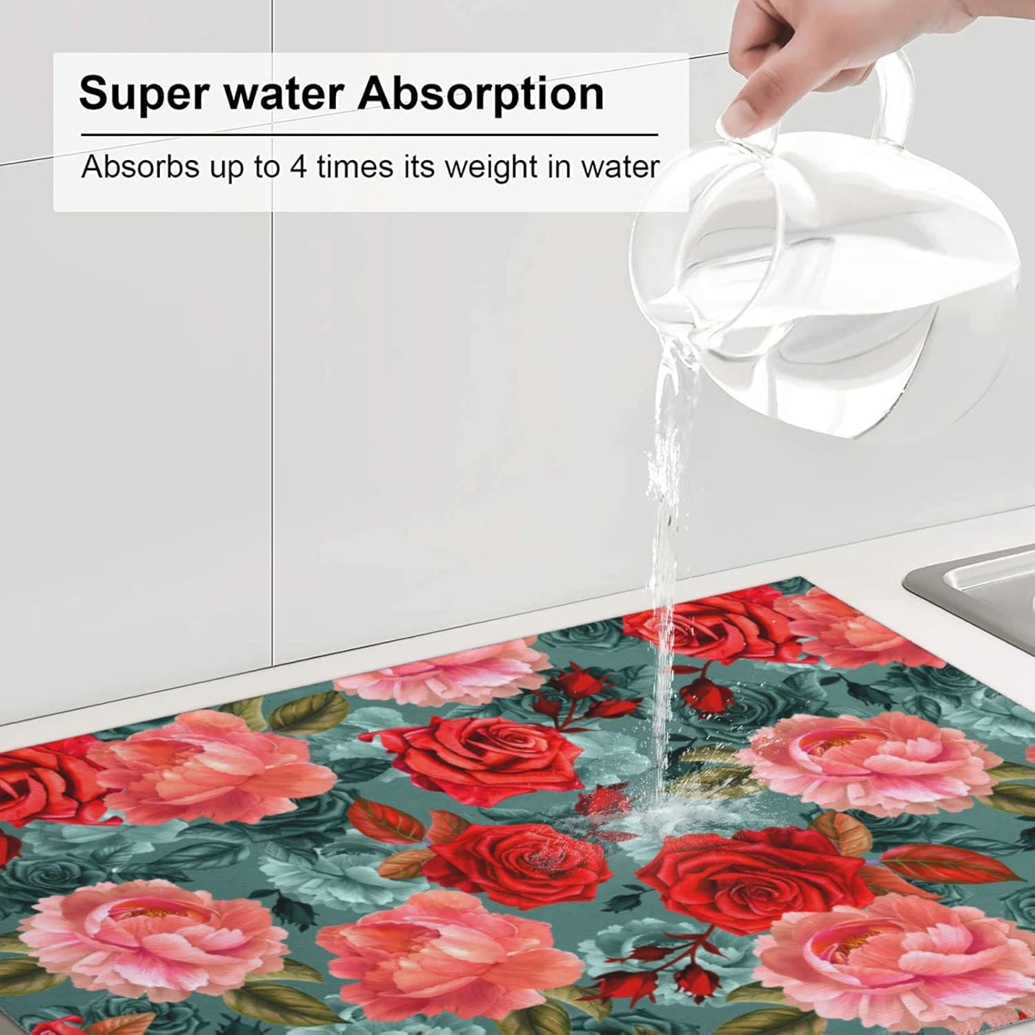 Floral Boho flowers Dish Drying Mat For Kitchen Counter 18 X 24 Inch Absorbent Dish Mat Reversible Drainer Drying Kitchen Mat