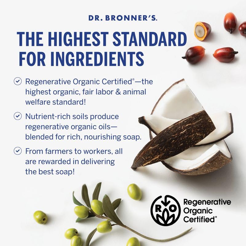 • MADE WITH ORGANIC OILS & CERTIFIED FAIR TRADE INGREDIENTS: Dr. Bronner's soap liquid is made with over 70% certified organic & fair trade ingredients, promoting healthy communities, ethical working conditions & fair prices. And now sourcing Regenerative Organic Certified coconut, palm kernel, and olive oil