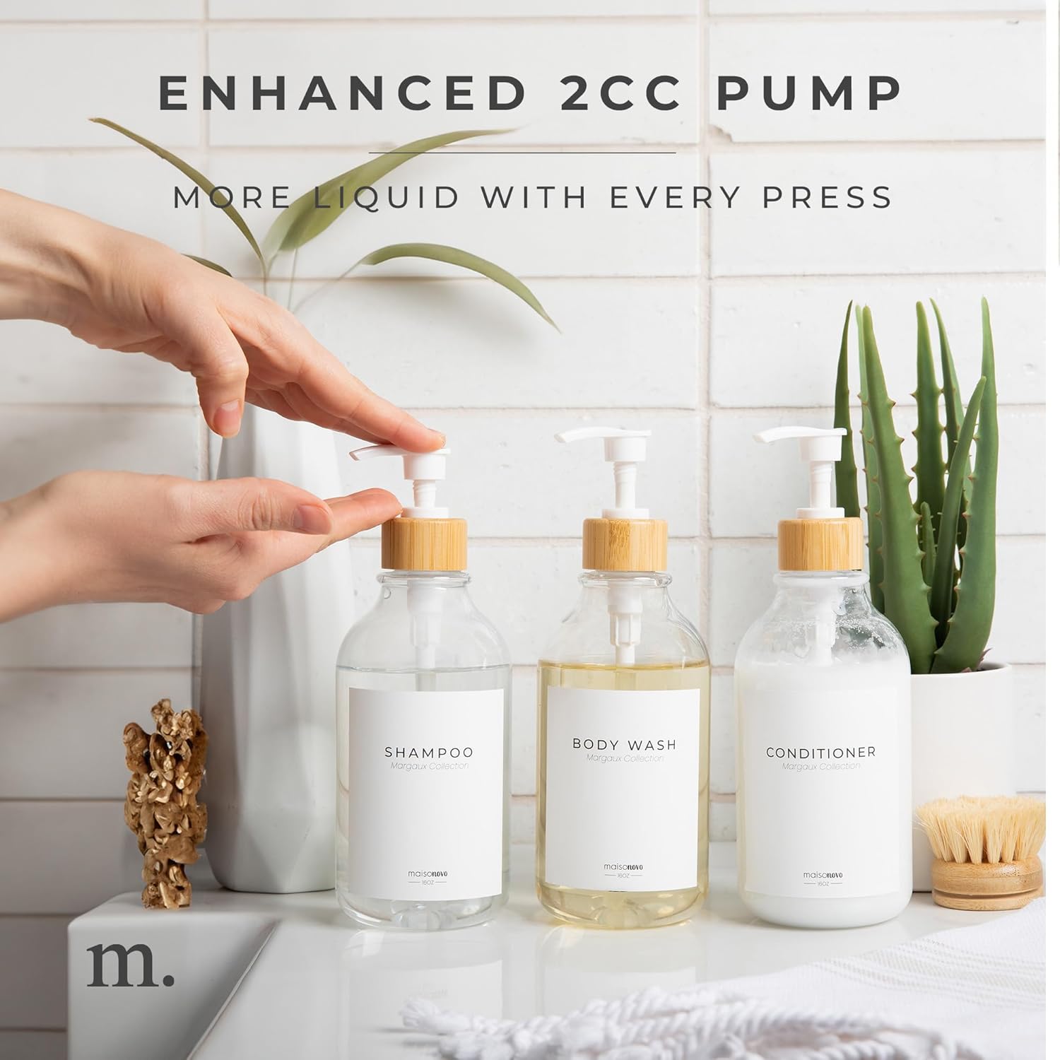 MaisoNovo Refillable Shampoo and Conditioner Bottles | 16.9 fl oz Set of 3 Clear Plastic Bottles White Bamboo Pumps