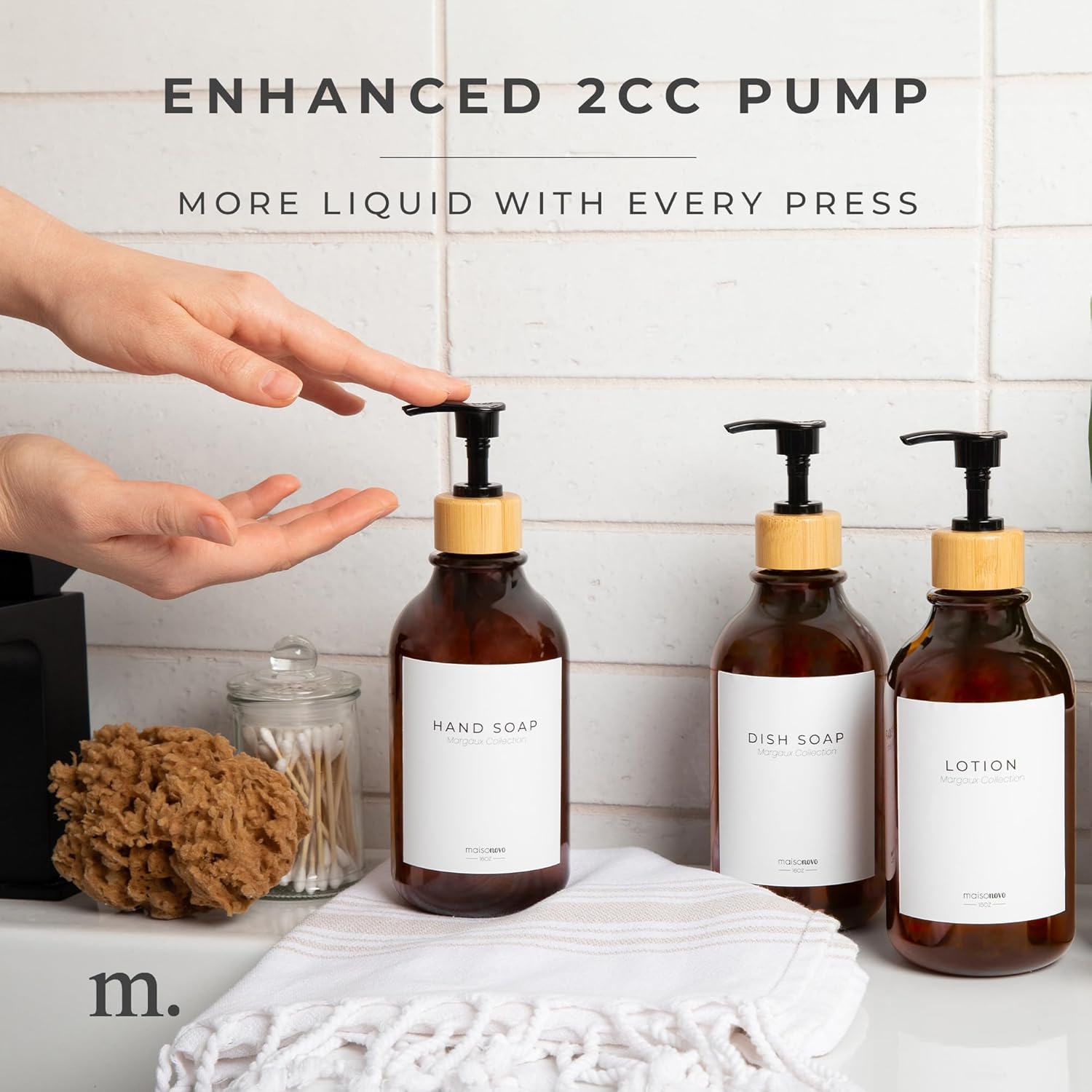 MaisoNovo Refillable Shampoo and Conditioner Bottles | 16.9 fl oz Set of 3 Amber Plastic Bottles Black Bamboo Pumps