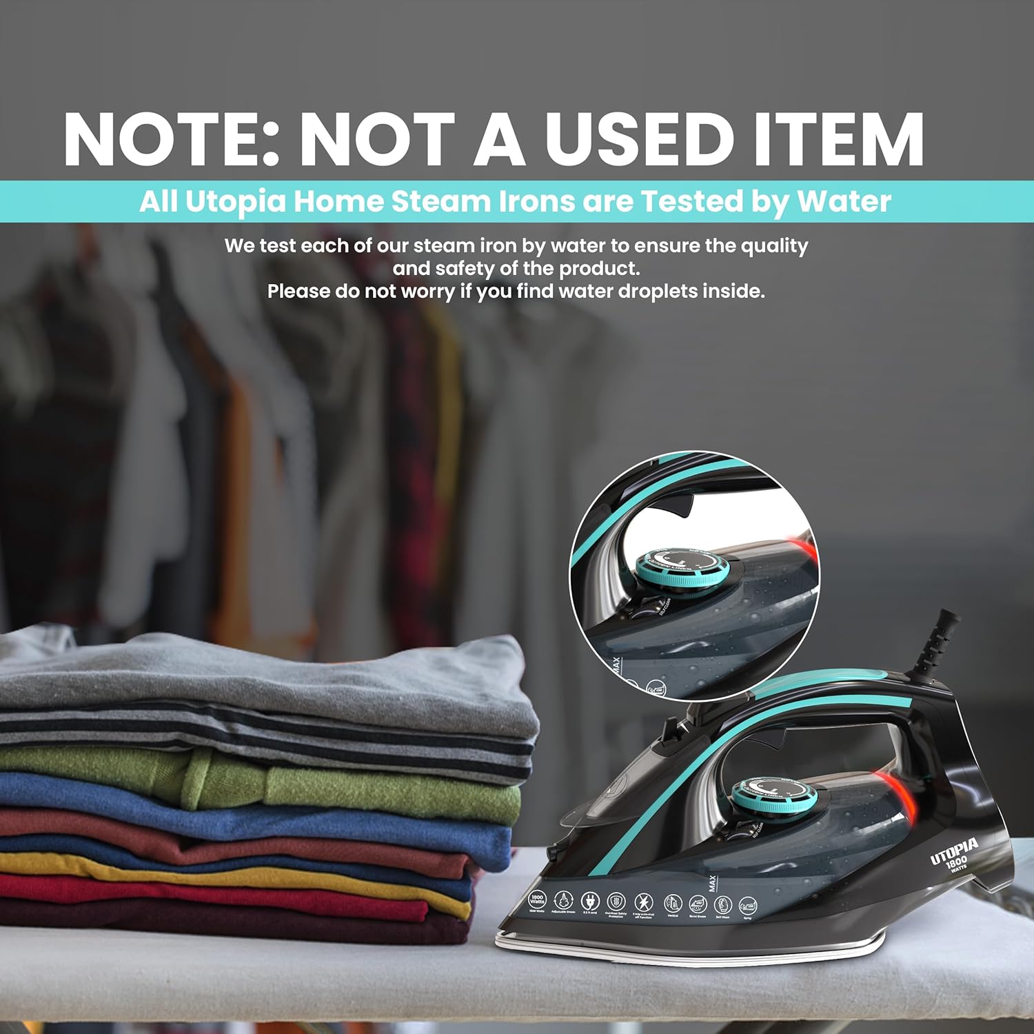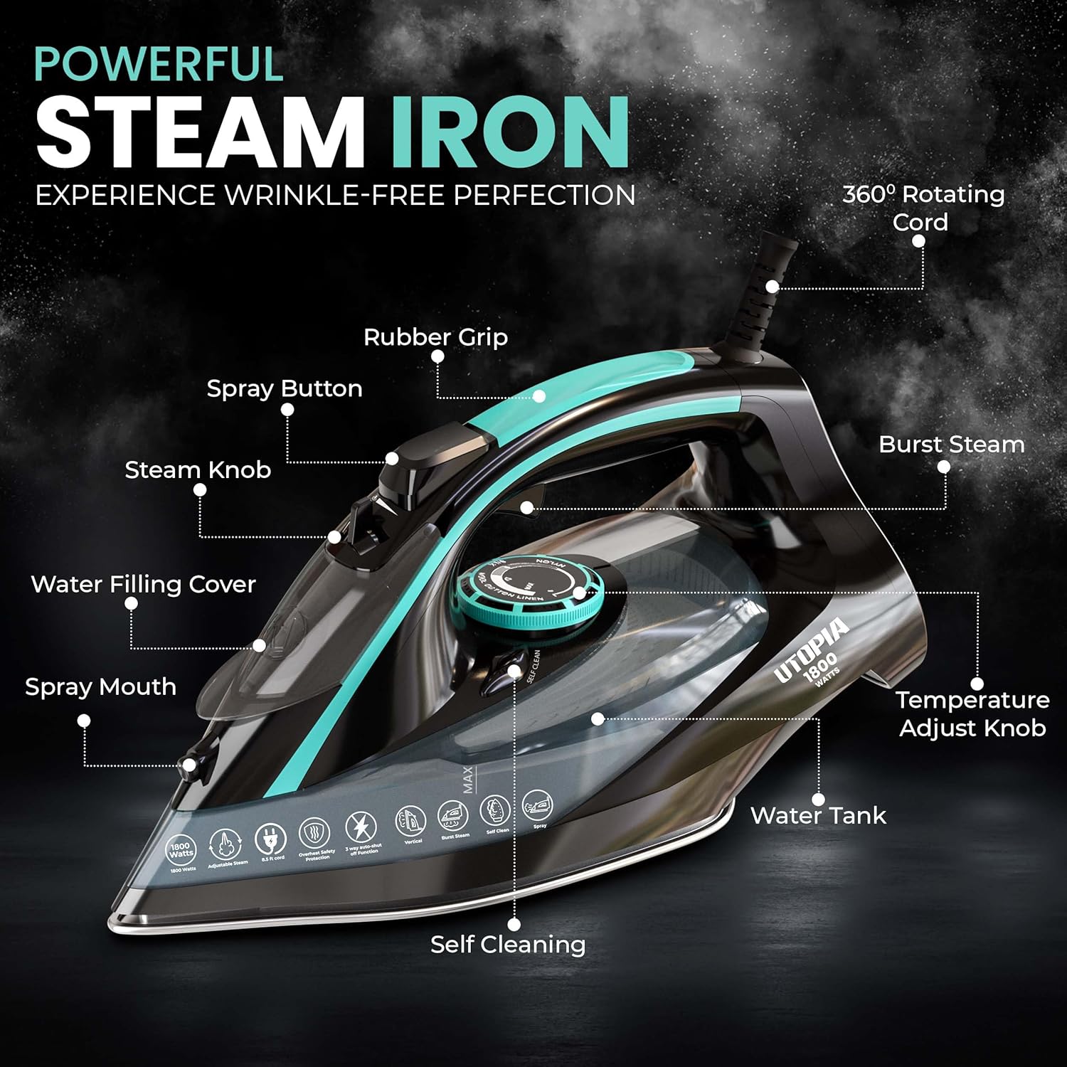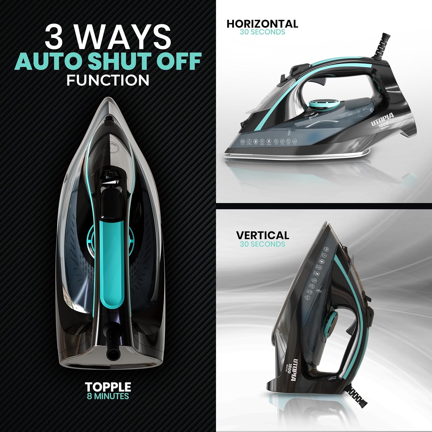 Utopia Home Steam Iron for Clothes - Non-Stick Soleplate - 1800W Clothes Iron With Auto-Off Safety Feature - Adjustable Thermostat Control, Variable Steam Control, Self-Clean, 8 Feet Cord (Black/Teal)