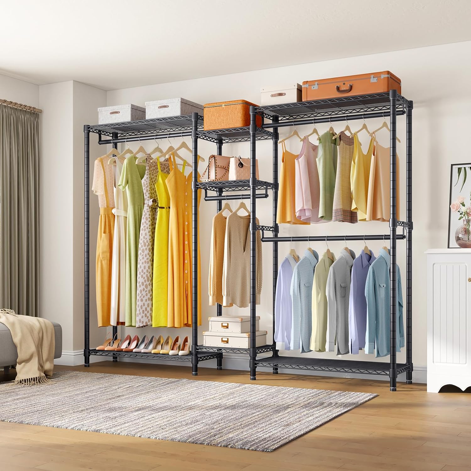 - Multifunction Clothes Rack: Including 7 adjustable shelves and 4 detachable hanging rods for hanging suits, coats, long dresses, jackets, pants, shirts or other heavy clothes. This freestanding closet system ensures you enough space for the essentials. It's a great closet organizer for extra hanging space or seasonal storage