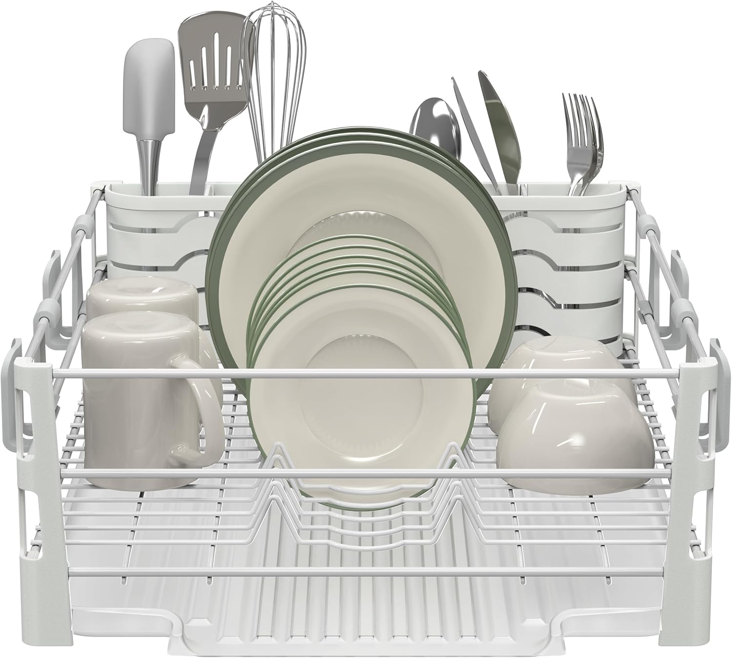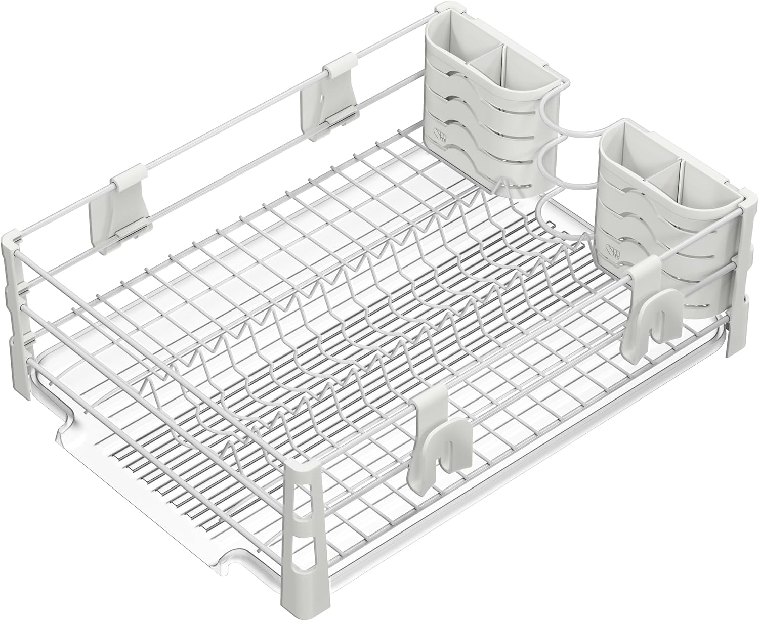 SIMPLE HOUSEWARE White Dish Drying Rack with Drainboard, Utensil Holder & Mug Hooks – Metal Kitchen Counter Organizer