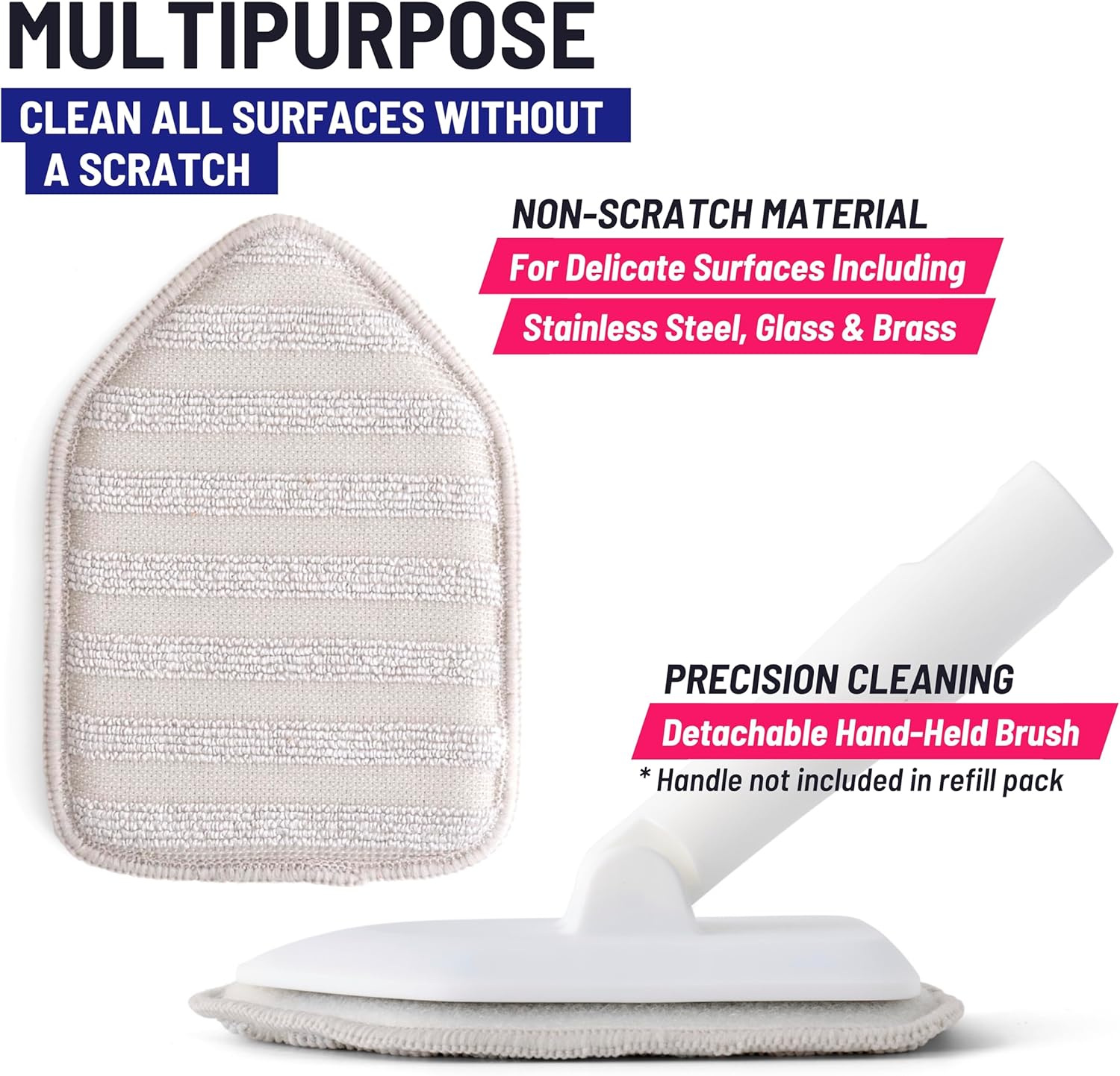 • 3-in-1 MULTIPURPOSE CLEANING -- The 2x Microfiber Pad Refills measure 6.5 inches in length x 4.5 inches in width and are made of non-scratch materials. Suitable surfaces include Porcelain, Ceramic, Marble, Mosaic, Fiberglass, Acrylic, Vinyl, Plastic, Wood, Zinc, Glass, Stainless Steel and Brass