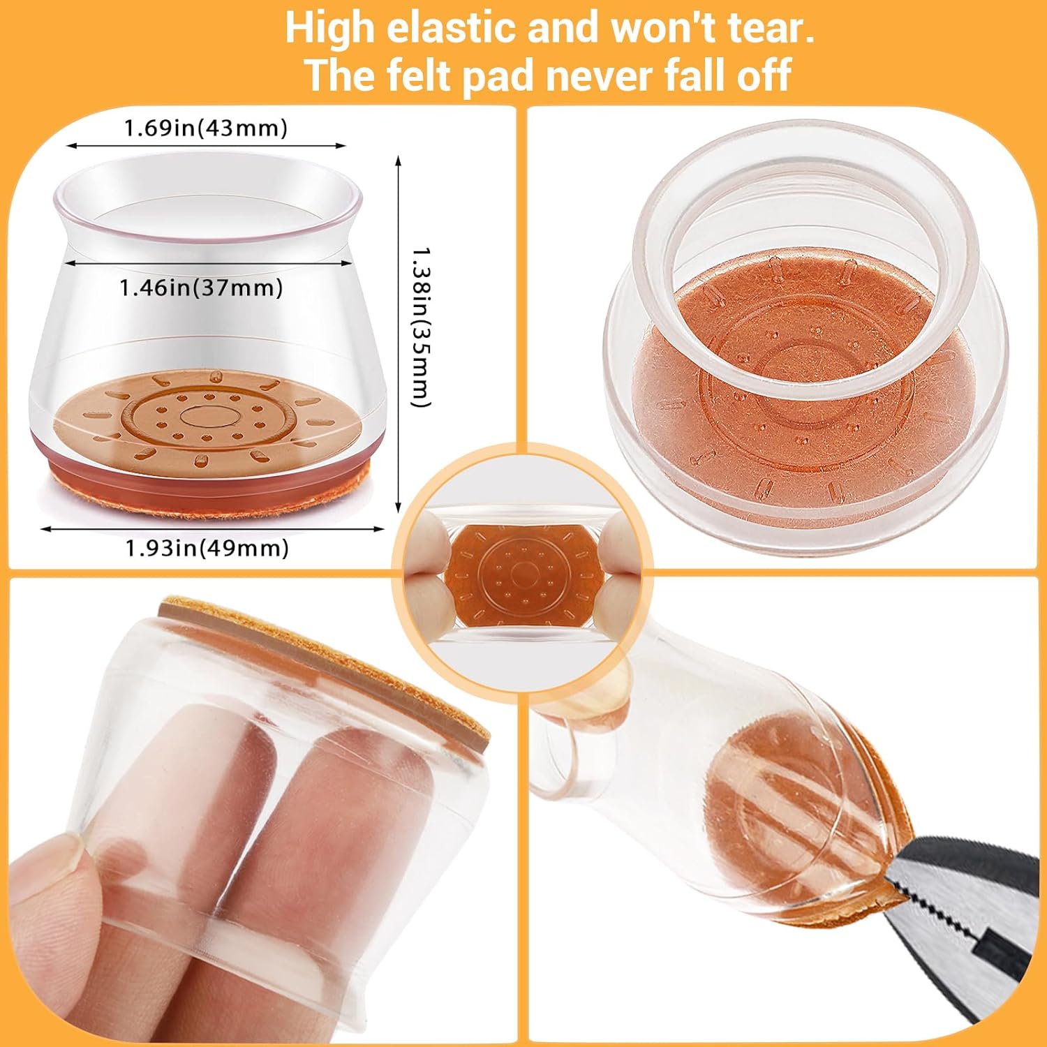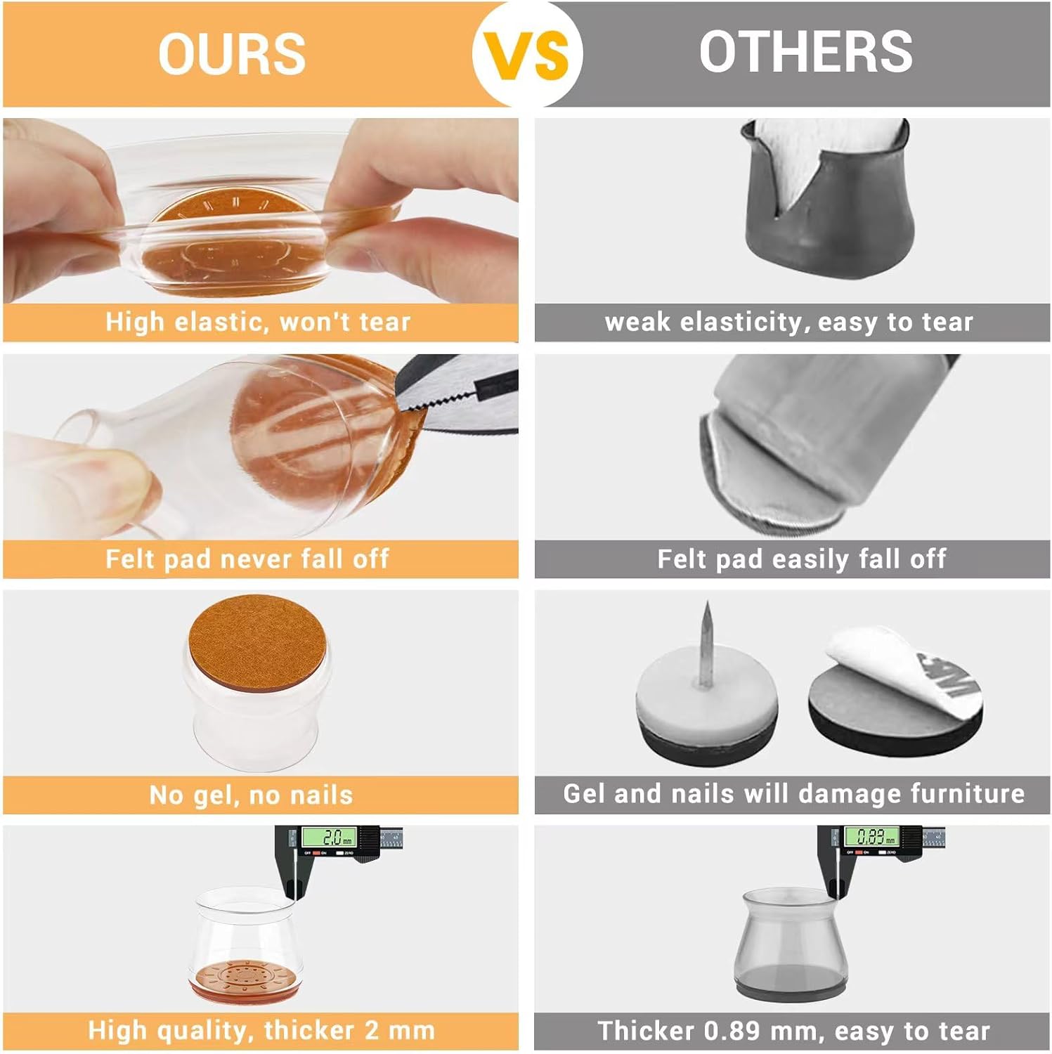 • 【The Felt Pad Never Fall Off】: Latest upgrade! Our chair leg protectors for hardwood floors do not use gel. The bottom felt pad and the silicone chair leg floor protectors are integrated with a high-pressure machine to ensure that they will never fall off. Ordinary felt furniture pads use gel, which is not strong enough, the felt pads are easily sliding off and stain your floor.