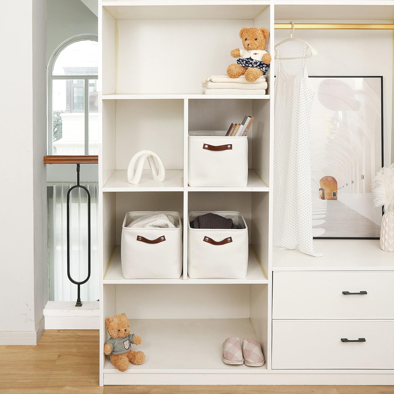 • Decorative Fabric and Vegan Leather – These versatile storage baskets for organizing your everyday life are made with a thick, high-quality fabric and fitted with leather handles to add a stylish touch to a living room, bedroom, office, or personal space.