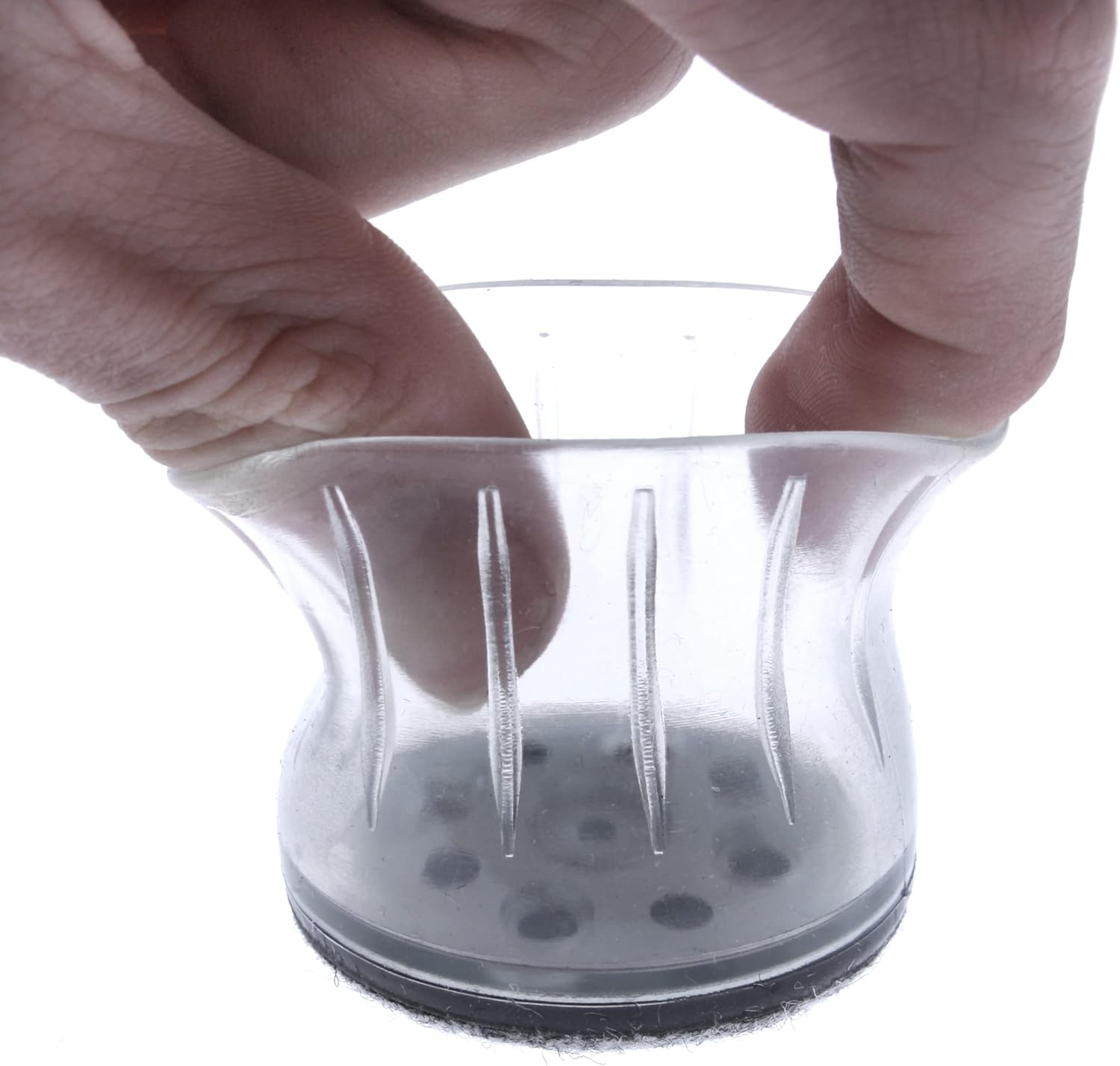 • Fits square & round furniture legs – These stretch to fit chair pads securely fit round legs 1-1/2” to 1-3/4” in diameter (38 – 44mm) and square legs 1-3/8” to 1-5/8” in diameter (34 – 40mm). The tube that holds the furniture leg is made of an advanced polymer material that is strong, tear resistant, long lasting, and clear for low visibility.
