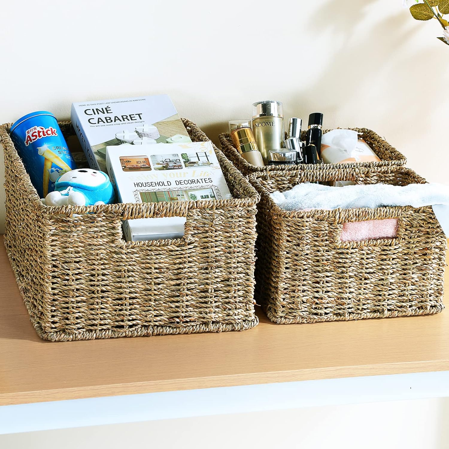 • Natural and Sustainable: these storage baskets for shelves are made of naturally grown seagrass in a woven pattern, the material is natural and friendly to the environment.