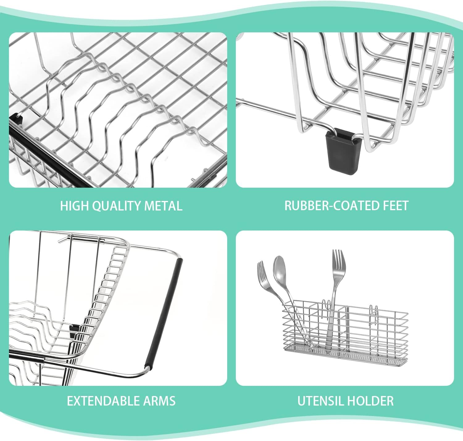 Sink Dish Drainer Rack, Expandable 304 Stainless Steel Dish Drying Rack Organizer with Stainless Steel Utensil Rack, Adjustable 15.35" to 20.47" Inside The Sink (up to 13 Upright Utensils).