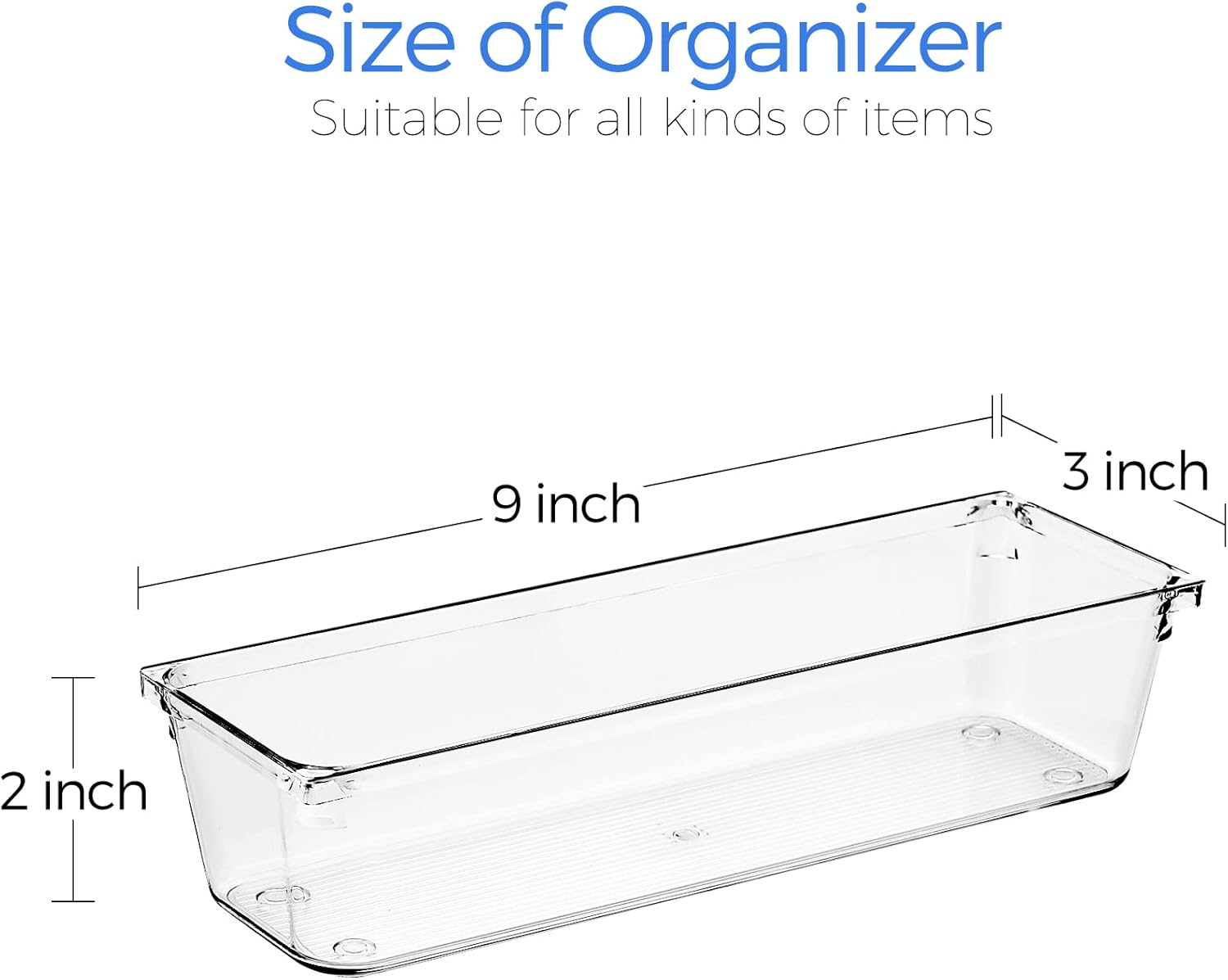 Ravinte 6 Pack Drawer Organizer - 3" X 9" Plastic Storage Bins, Acrylic Organizers with Non-Slip Pads Clear Desk Storage Tray for Makeup, Jewelries, Kitchen Utensils, Bathroom and Office