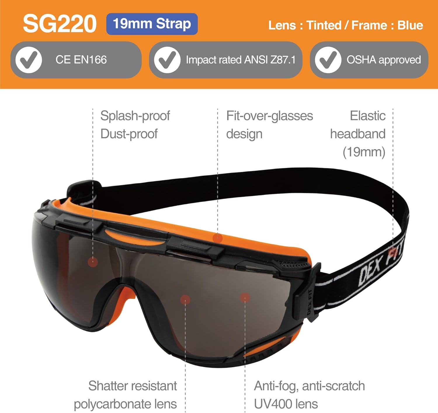 DEX FIT Protective Safety Goggles SG220; Anti Fog & Scratch, Z87 Eye Protection for Work, Adjustable for Women and Men, (Black & Orange Frame, Tinted Lens, 19cm Strap)