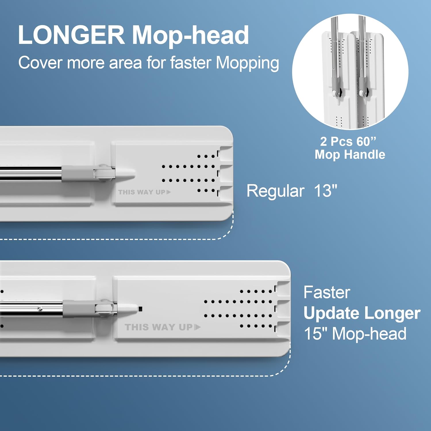 • [Longer and Larger Mop Bucket] Includes a X-Large White Bucket #5, two Extended 60" handle with Bigger 15" flat head mops! Suitable to be a wall mop or a wall cleaner with long handle. Self cleaning mop with the larger bucket, SAVE your time and labor, let the bucket do more than by yourself, mopping is just between mop and bucket, be free from dirty water, All you need to do is moving the squeeze mop