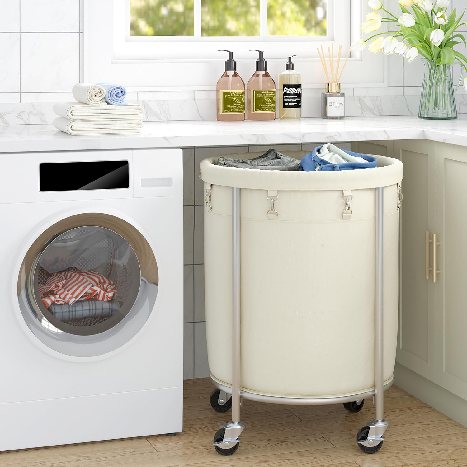 ELYKEN Laundry Basket with Wheels, 170L Rolling Laundry Hamper with Removable Bag and Steel Frame, Round Laundry Cart with 4 Casters and 2 Brakes, Ideal for Bedroom, Bathroom, Laundry Room, Cream