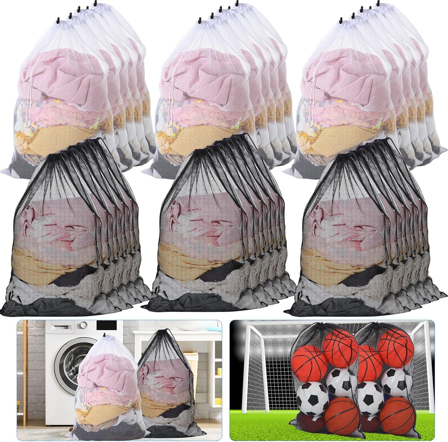 Berlune 30 Pack 24 x 36 Inches Large Mesh Bags for Laundry, Wash bags, Sturdy Mesh Material Closed with Drawstring, Factory, University, Dormitory, Travel and Apartment Dweller (Black, White)