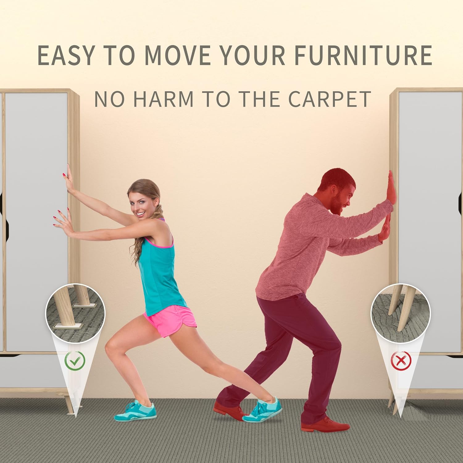 • FURNITURE MOVING PADS PROTECT ALL CARPET SURFACES - 8 pcs 4 3/4” beige square furniture sliders for carpet. Just put these rubber foam under the furniture feet to move it, no more scratches and noise here!