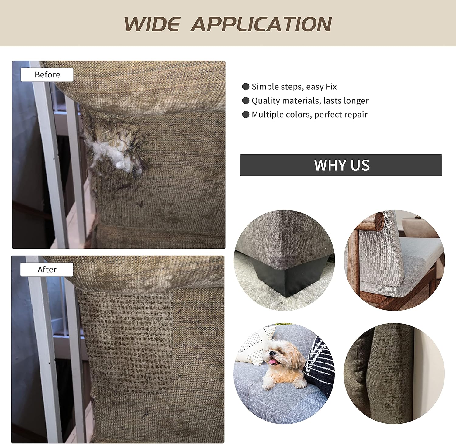 • HIGH QUALITY PRODUCTS: Coarse Linen Patch and strong adhesive. No glue residue, perfect fit in seconds. Brand new upgraded, with more glue, firmly press on the broken parts, the glue reaches the best outcome after 24 hours. Linen is durable, non-pilling, non-fading, non-shrinking and is suitable for all seasons.