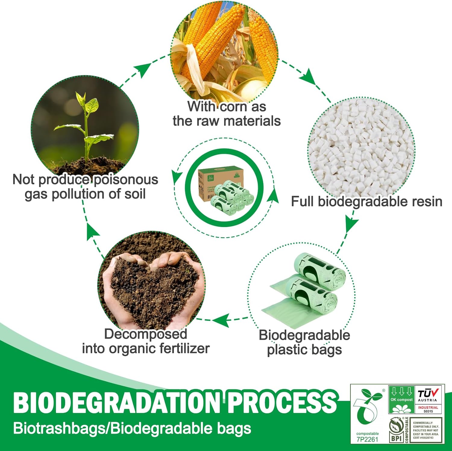 • Biodegradable Trash Bags: These small medium Large garbage bags made from entirely materials such as corn starch and plant-based, our biodegradable garbage bags will degrade to CO2, water and organic biomass after 6-12 months.